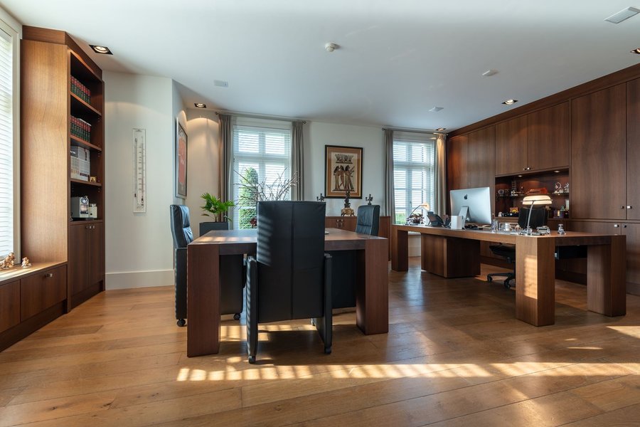 Representatieve hal met trapopgang, garderobe, meterkast, lift en toiletruimte. Aan de voorzijde bevindt zich een ruim kantoor met maatwerk kasten. De woonkamer beschikt over veel daglicht, een sfeervolle erker en openslaande deuren naar het terras op het oosten. Via ensuite deuren is de tv-kamer bereikbaar, voorzien van moderne schouw en dubbele tuindeuren naar het overdekte en verwarmde buitenterras met glazen schuifwanden.