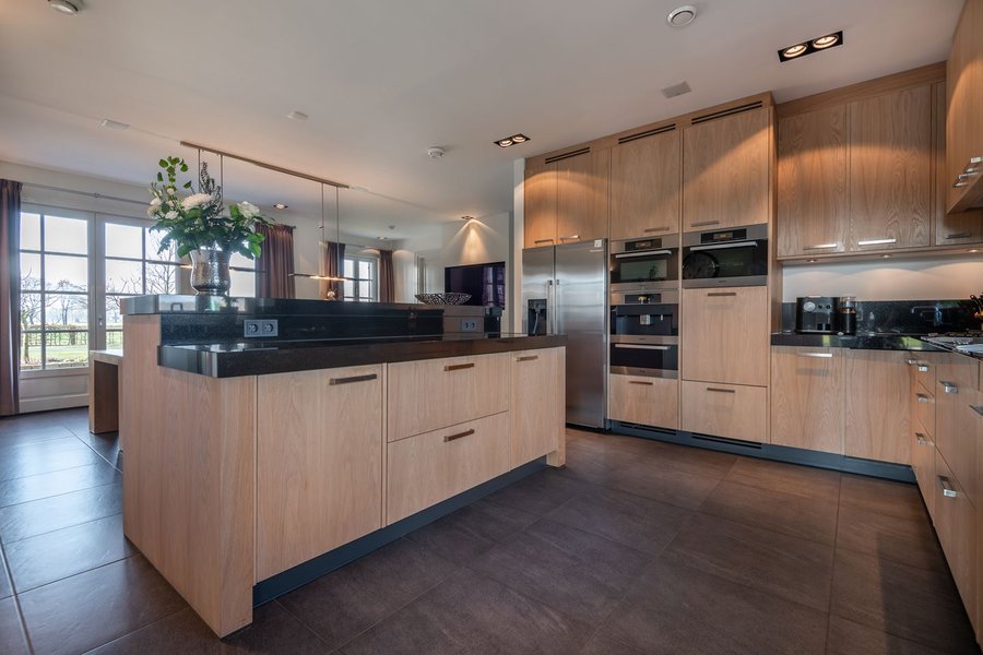 De woonkeuken is royaal opgezet en uitgerust met onder meer een koffiemachine, steamer, warmhoudlade, wijnklimaatkast en vier Scholtes koellades. Vanuit de keuken zijn het terras op het zuiden, de bijkeuken met witgoedaansluitingen, tweede toilet, waskoker en berging bereikbaar. Ook bevindt zich hier een extra werk-/computerruimte.