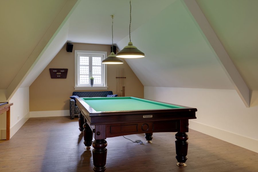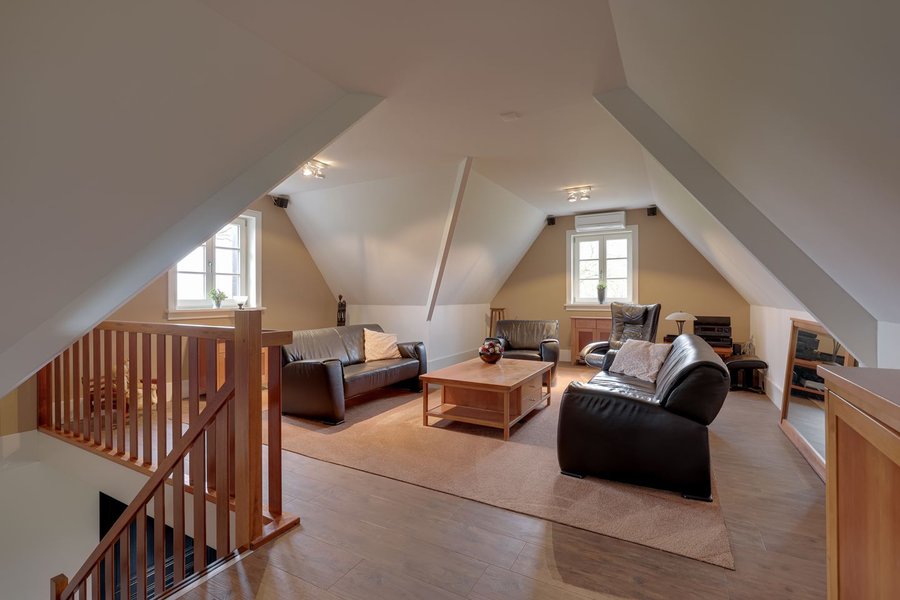 Ruime dubbele garage met elektrisch bedienbare deuren, technische ruimte, berging met toilet, en trapopgang naar een zitkamer en grote zolderverdieping. Ook hier is een airco-installatie aanwezig. De schuur is volledig geïsoleerd en beschikt over vloerverwarming.