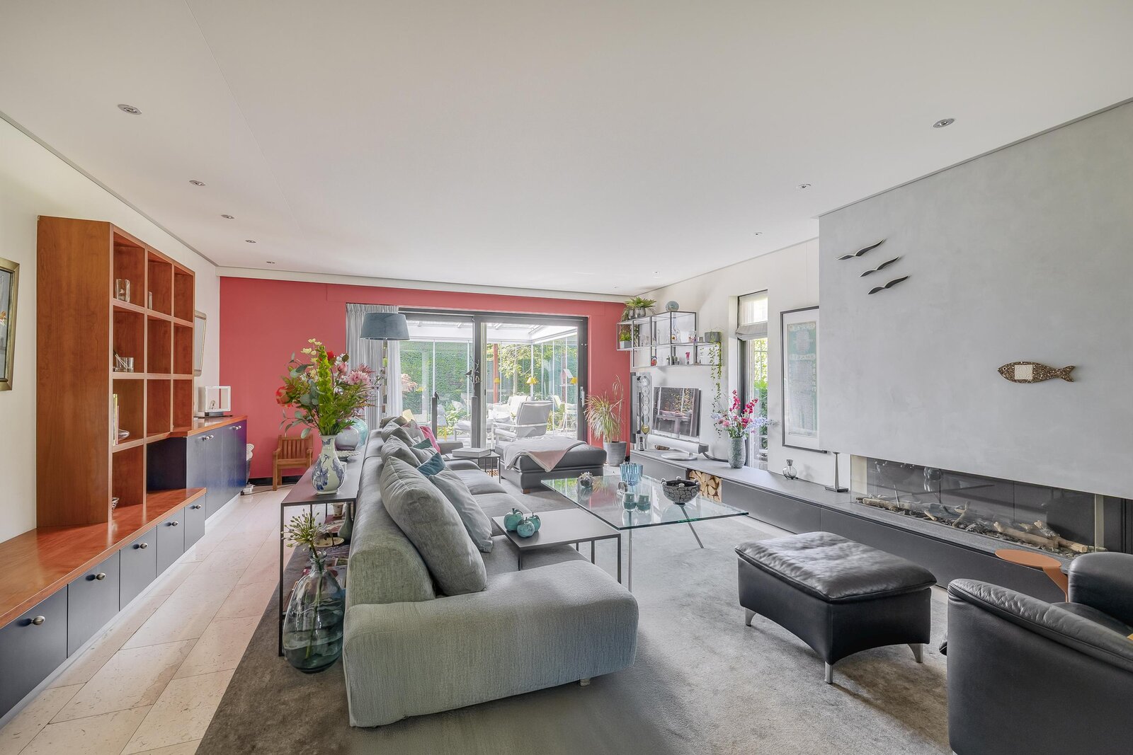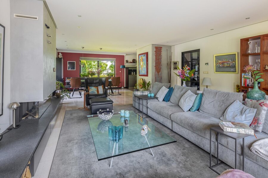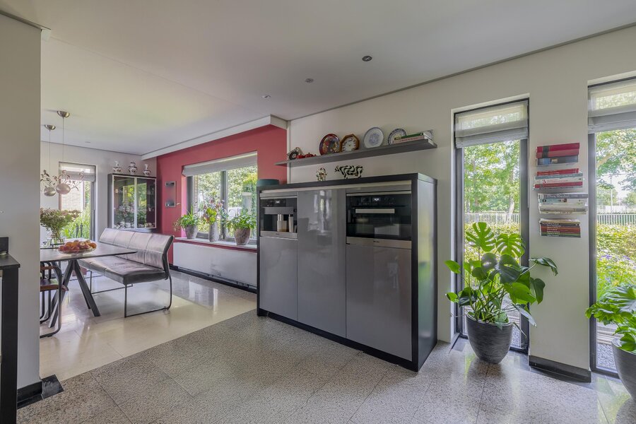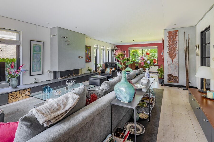 De sfeervolle leefruimte van ruim 63 m² is speels en licht, met een gezellige zithoek rond de haard, een cinewall en een schuifpui naar de royale serre van 19,5 m². De eetkamer sluit naadloos aan op de moderne keuken, die is uitgerust met alle wenselijke inbouwapparatuur. Een praktische bijkeuken maakt het geheel compleet.