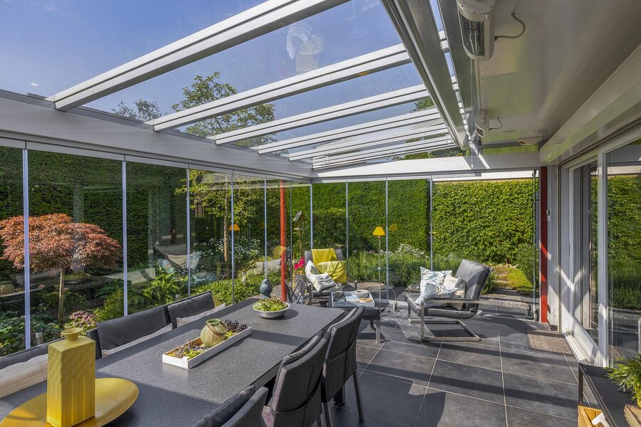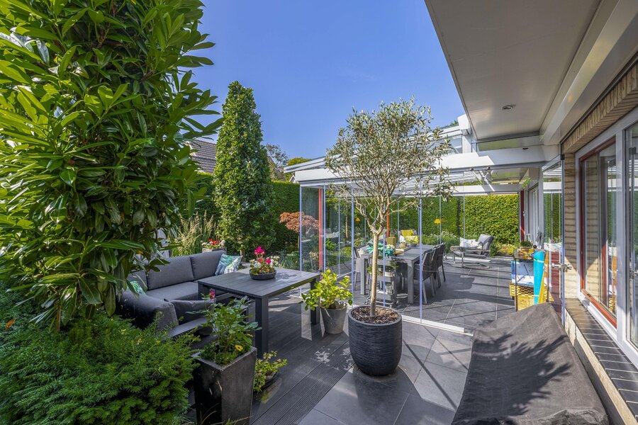 Direct grenzend aan de woonkamer, toegankelijk via een schuifpui, bevindt zich de sfeervolle serre van ca. 19,5 m². Deze lichte ruimte is rondom voorzien van glazen panelen, waardoor je het hele jaar door kunt genieten van het uitzicht op de groene achtertuin. De vloer is afgewerkt met fraaie tegels en vloerverwarming, en dankzij de zonwering en twee comfortabele heaters is dit een plek waar je elk seizoen aangenaam kunt verblijven – van ontspannen ochtendkoffie tot lange avonden met een goed glas wijn.