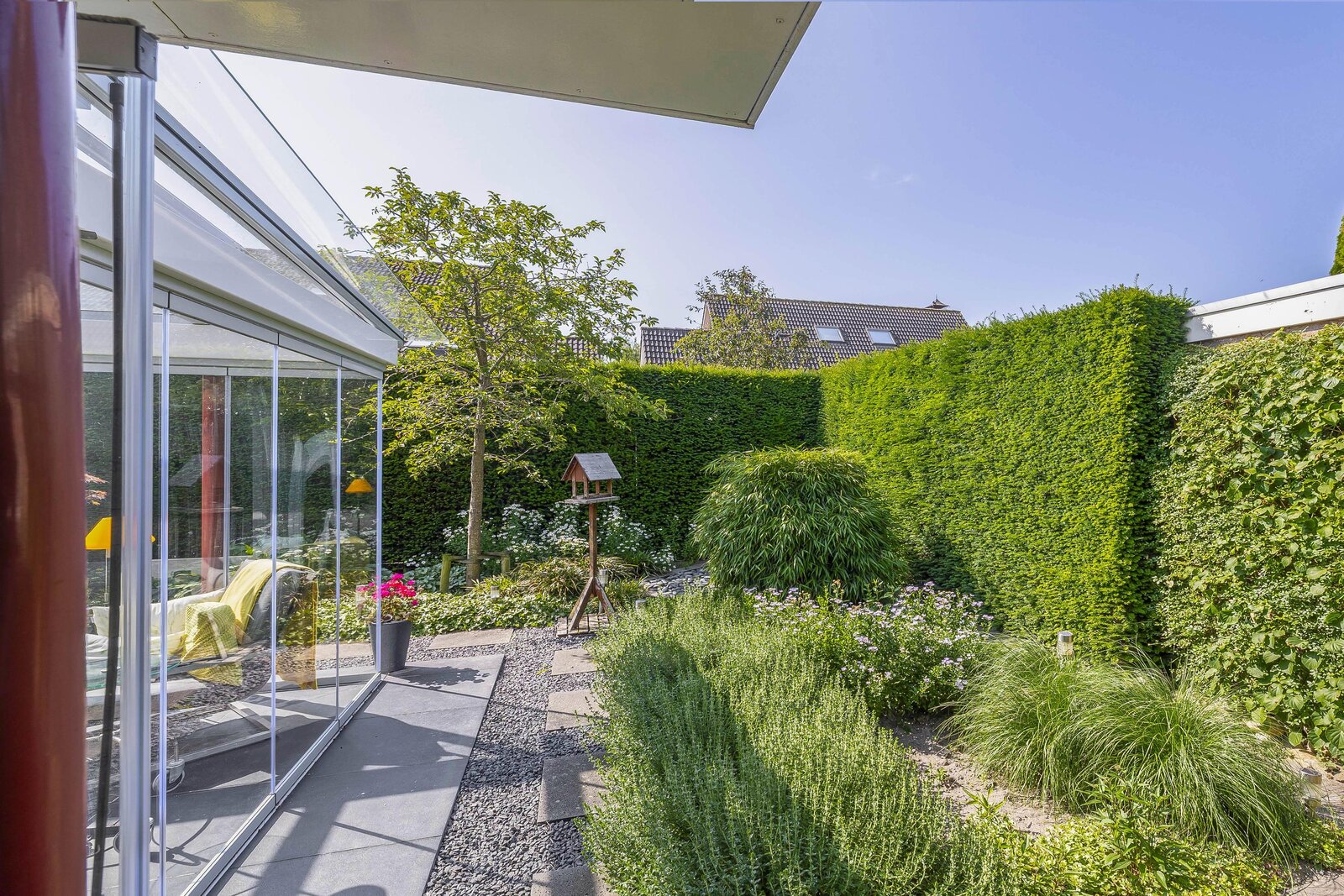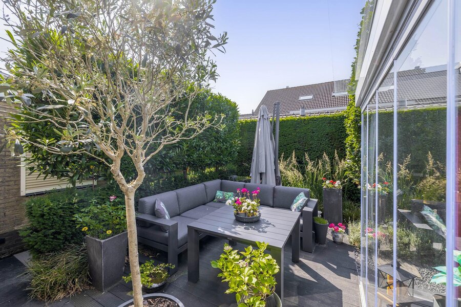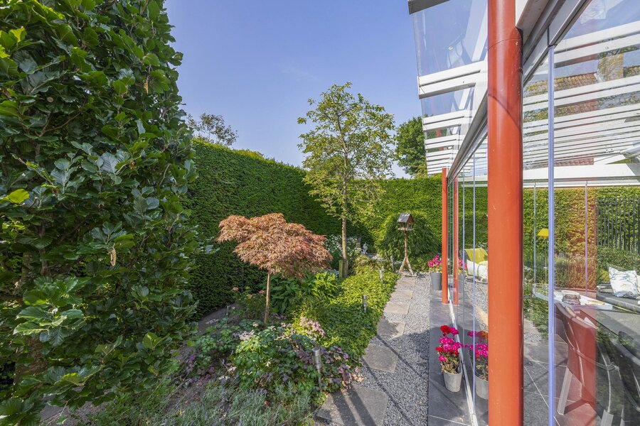 Het perceel van 438 m² is prachtig aangelegd en biedt rondom de woning een verzorgde tuin. Aan de voorzijde siert een fraaie voortuin met diverse beplanting het straatbeeld. De zijtuin op het westen vangt de middagzon, terwijl de achtertuin op het zuiden volop privacy biedt dankzij een hoge coniferenhaag. Hier geniet je in alle rust van meerdere gezellige terrassen met mooie bestrating, en van de royale serre die het buitenleven op elk moment van het jaar mogelijk maakt.