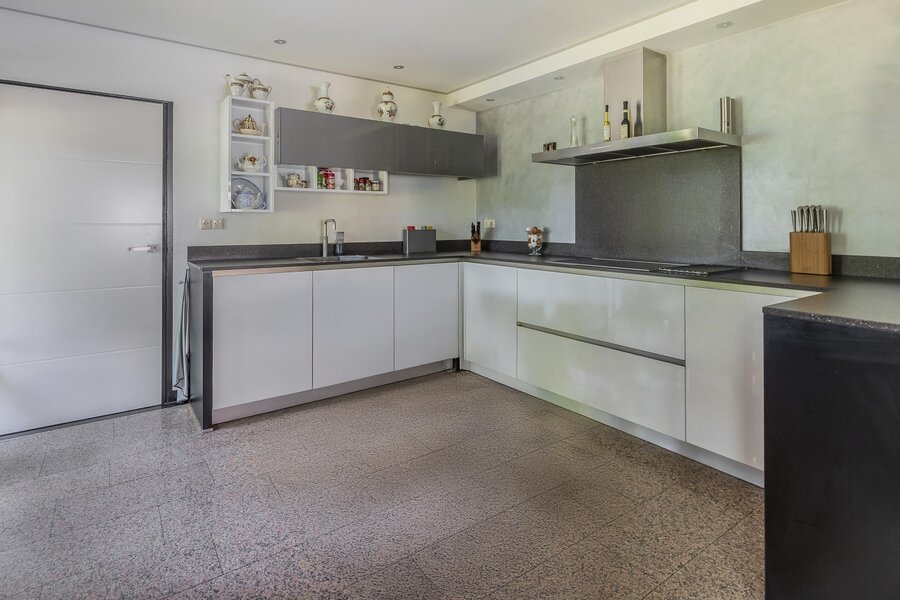 De open keuken grenst direct aan het eetgedeelte en is ingericht in een strakke L-vorm met greeploze fronten. Een hoge kastenwand herbergt onder andere een ingebouwde koffiemachine en combi-oven. Centraal in de ruimte staat een robuust hakblok – zowel praktisch als stijlvol. Verder is de keuken voorzien van alle wenselijke inbouwapparatuur, zoals een inductiekookplaat, roestvrijstalen afzuigkap, vaatwasser én een Quooker-kraan voor direct kokend water.