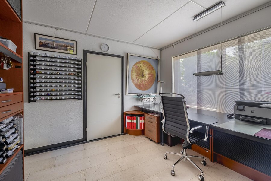 De begane grond is volledig ingericht voor gelijkvloers wonen. De royale kamer aan de tuinzijde, momenteel een inspirerend kantoor met prachtig lichtinval, is ook ideaal als slaapkamer. Aangrenzend vind je een badkamer – perfect voor levensloopbestendig wonen of voor gasten die privacy waarderen.