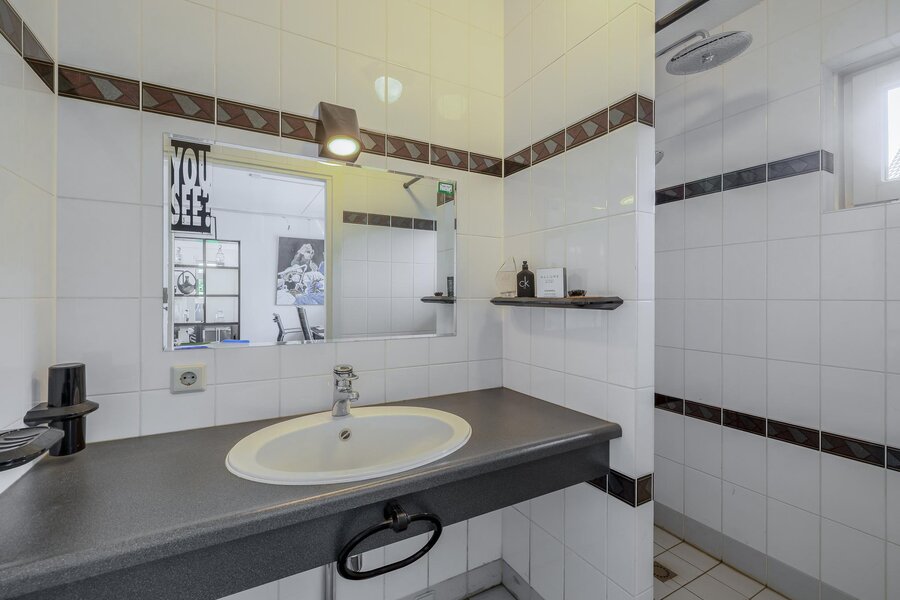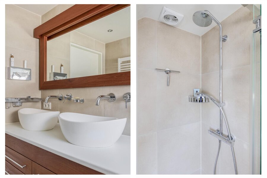 Strak vormgegeven, modern en efficiënt ingedeeld. Deze tweede badkamer is uitgerust met een inloopdouche voorzien van de luxe Axor lampdouche en handdouche van ontwerper Philippe Starck, een zwevend toilet, een stijlvol wastafelmeubel met verlichte spiegel en een designradiator. Een perfecte mix van comfort en eigentijdse elegantie.