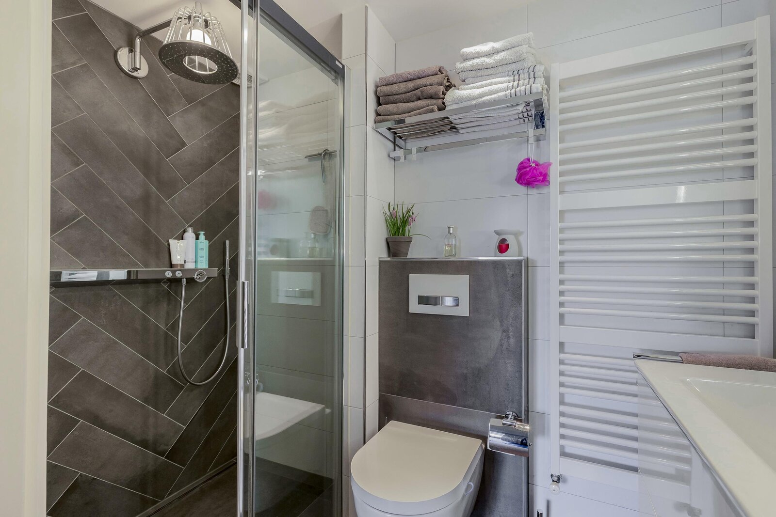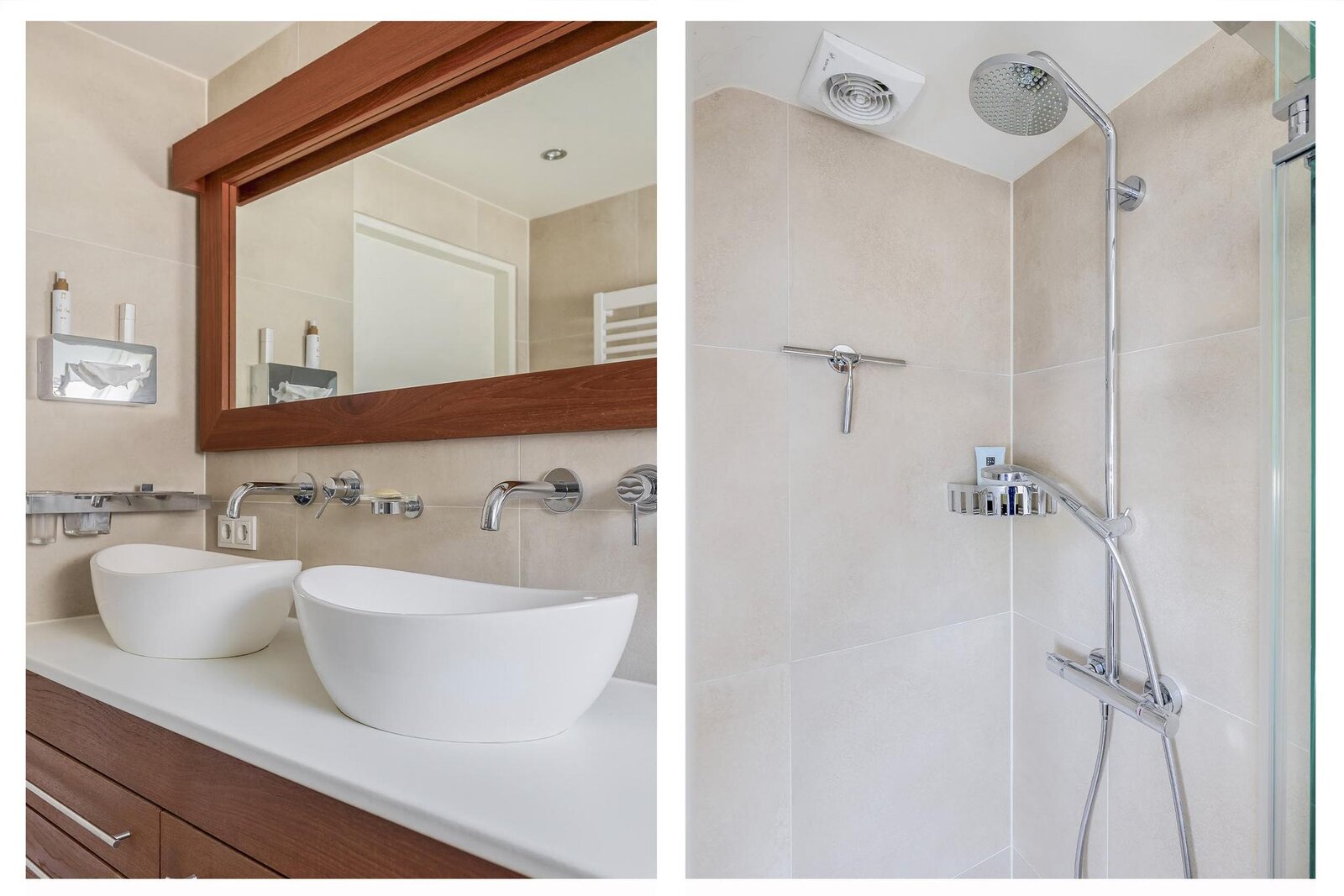 Deze ruime badkamer grenst direct aan de masterbedroom en ademt luxe. De ruimte is ingericht met een dubbel wastafelmeubel met moderne waskommen, muurkraan, een glazen douchecabine, een heerlijk ligbad en een designradiator. Onder het schuine dak is slimme bergruimte gecreëerd voor handdoeken en verzorgingsproducten. Een dakraam zorgt voor daglicht en natuurlijke ventilatie.