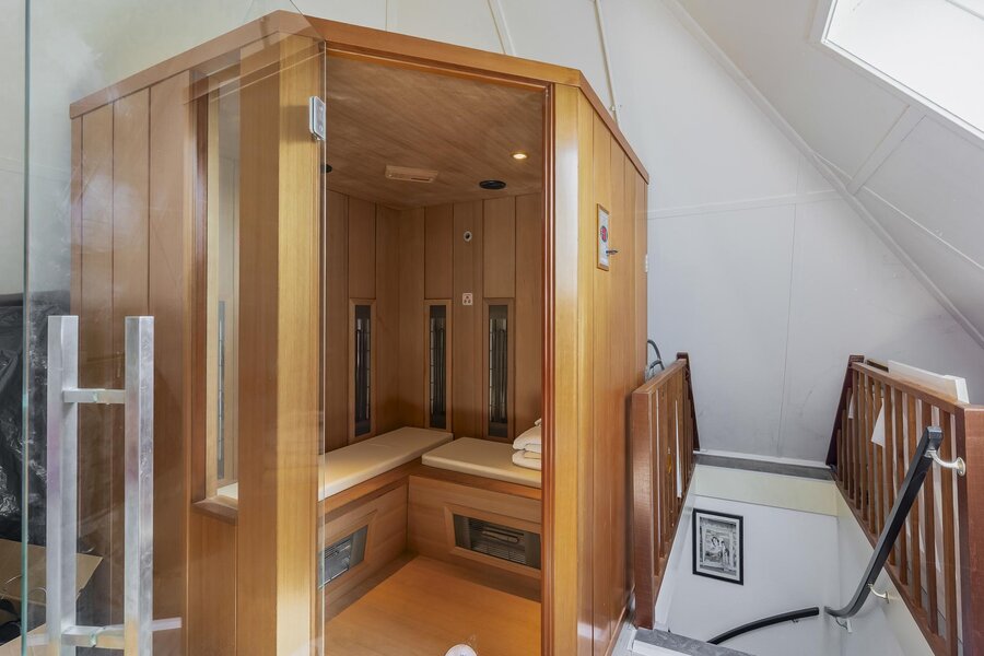 De zolder is momenteel ingericht als een luxe wellnessruimte, met als absolute blikvanger een comfortabele infrarood sauna voor drie personen. Deze royale hoek cabine is uitgerust met hoogwaardige stralers die op therapeutische wijze verlichting bieden bij spier- en gewrichtsklachten. Een ideale plek om te ontspannen, tot rust te komen en even helemaal op te laden.