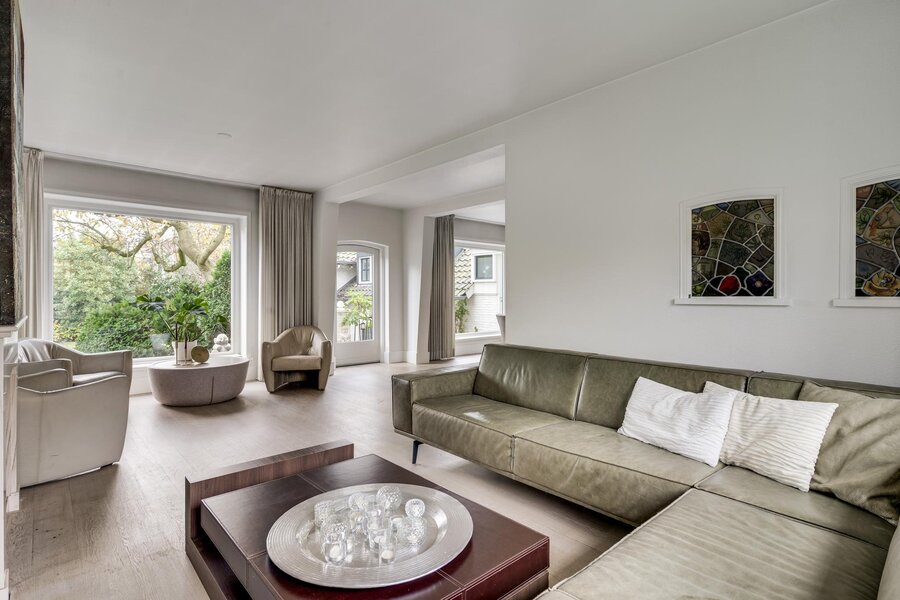 De entree verwelkomt u in een statige hal met authentieke tegelvloer, een meterkast en een indrukwekkende trappartij die leidt naar de eerste verdieping. Vanuit de hal betreedt u de ruime, lichte woonkamer met parketvloer en een klassieke marmeren haard met open haard, een gezellige plek voor avonden met familie of vrienden. De woonkamer loopt door naar de keuken, die is voorzien van een moderne, witte (Bulthaup) designinrichting en inductiekookplaat. Extra keukenapparatuur zoals oven, koelkast en vaatwasser zijn netjes geplaatst in de bijkeuken met aanbouwkeuken. Het toilet is modern en stijlvol met een zwevend closet en fonteintje. De keuken leidt naar een lichte tussenkamer met parketvloer en dakkapel, ideaal als werkruimte. Verderop vindt u nog een ruime 2e woonkamer, eveneens met parketvloer, twee dakkapellen en een knusse houtkachel, ideaal als speel/gamekamer voor de kinderen.