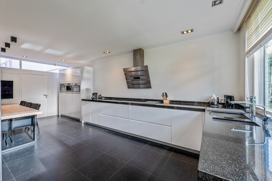 Bij binnenkomst valt direct de royale hal op, die dankzij grote ramen bijzonder licht is. Hier bevinden zich de garderobe en een zeer ruim toilet met urinoir. De ruime leefkeuken is uitgerust met diverse inbouwapparatuur, waaronder een Quooker, magnetron en heteluchtoven. Aansluitend ligt de sfeervolle woonkamer met een fraaie open haard en een tv-hoek. Grote ramen bieden een prachtig zicht op de tuin en de aangrenzende weilanden. Vanuit de woonkamer is er toegang tot het zonnige, op het zuiden gelegen terras.