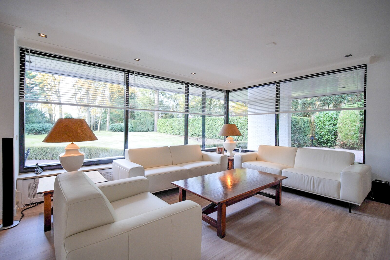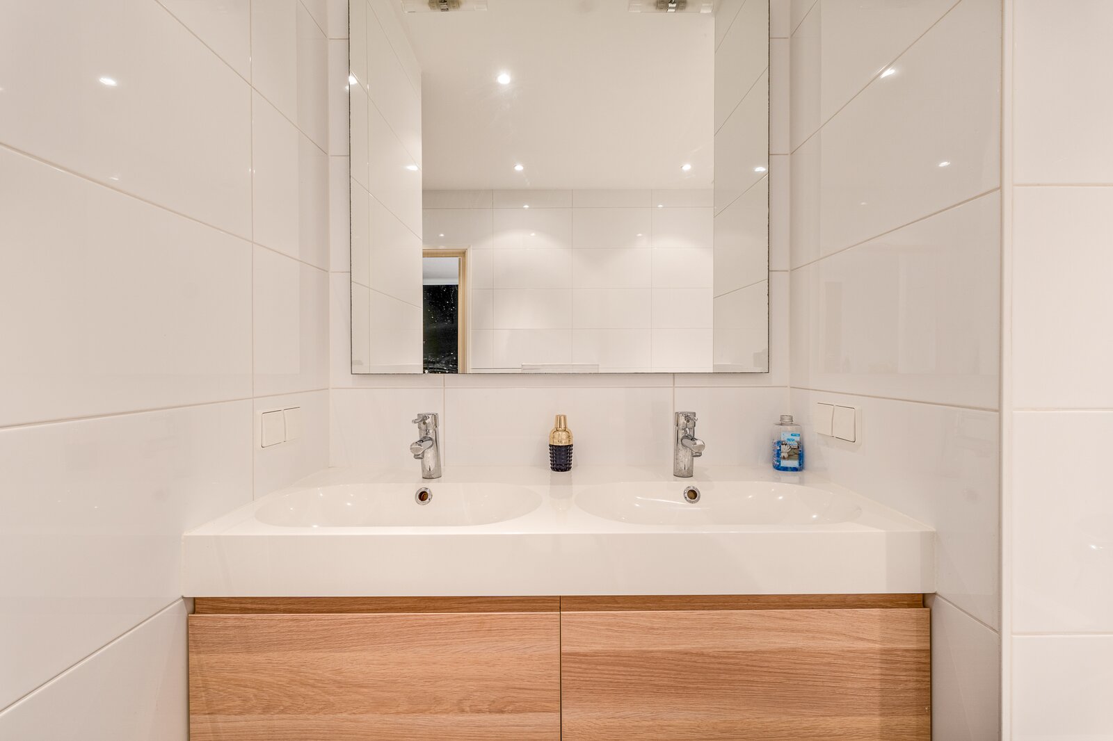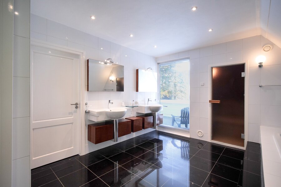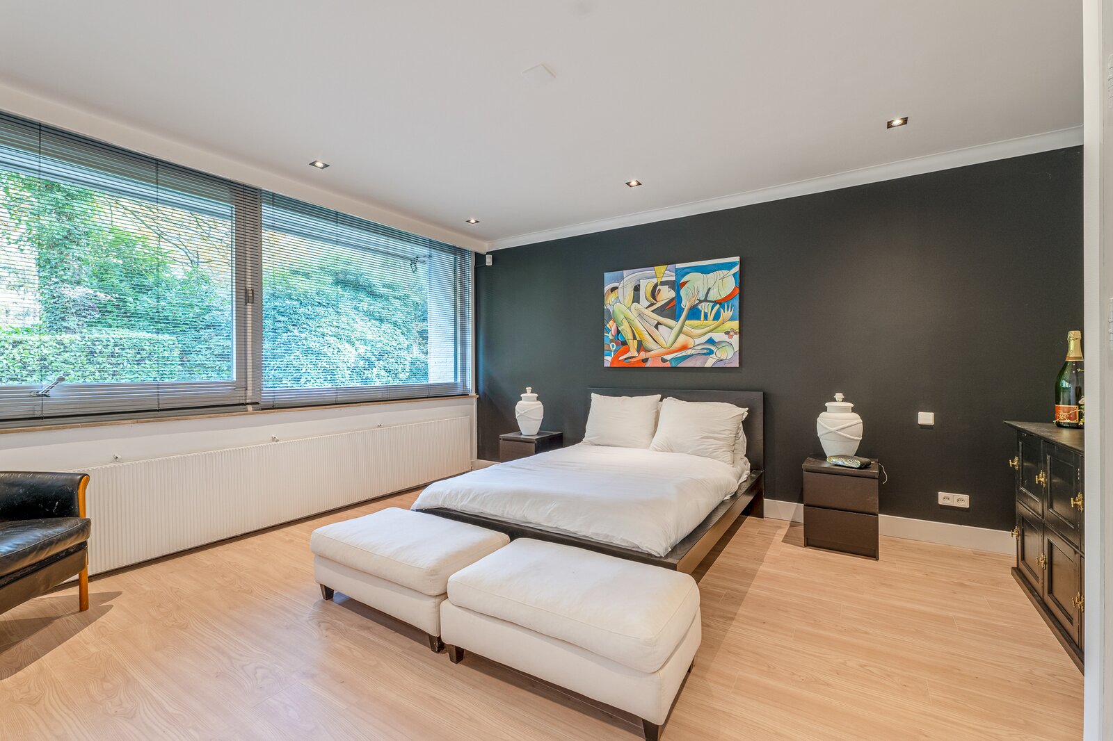 Daarnaast beschikt de begane grond over een ruime kantoorruimte met vaste internetaansluiting en uitzicht op de groene omgeving. Verder bevinden zich op deze etage een slaapkamer met ingebouwde kasten, een complete badkamer met ligbad, aparte douche, dubbele wastafels en toilet, een extra kamer en een bergkast met de cv-installatie.
