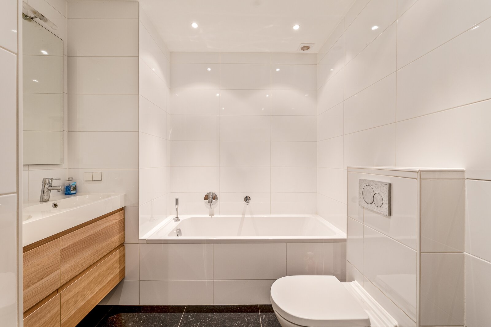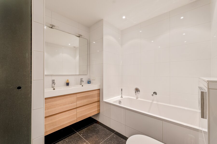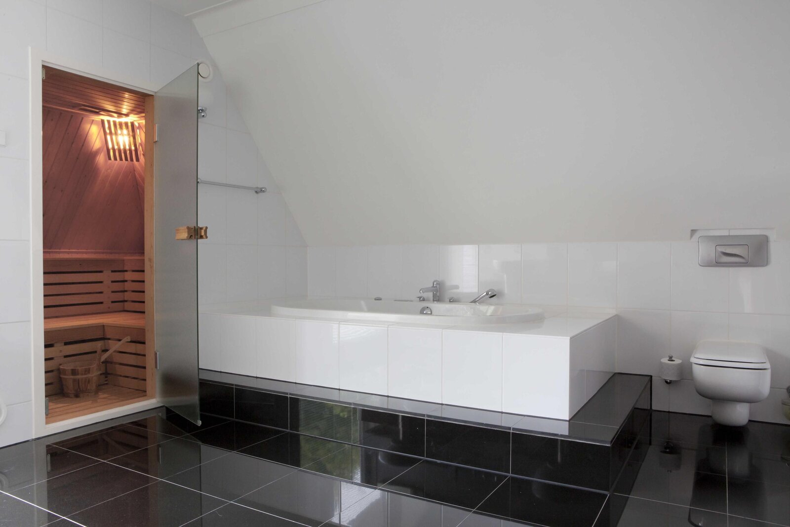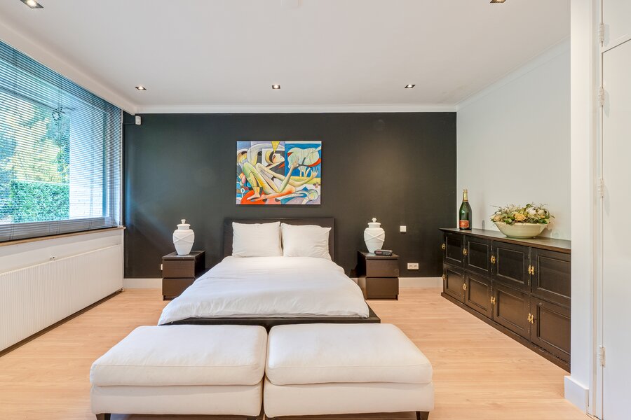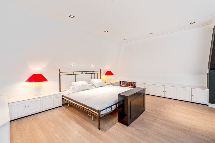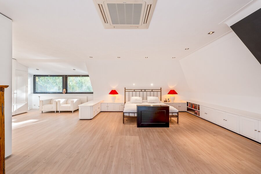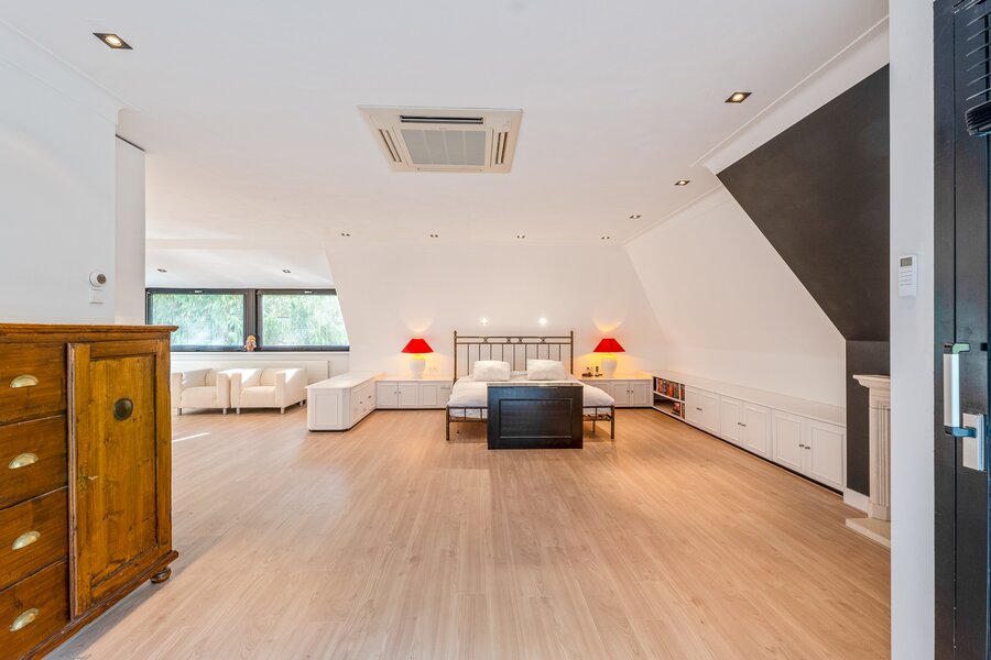 Op de verdieping bevindt zich een bijzonder royale ouderslaapkamer van circa 65 m², compleet met inbouwkasten, een zithoek met gashaard, airconditioning en panoramisch uitzicht over Naarden-Vesting. Vanuit deze kamer is er toegang tot de luxe badkamer, die is voorzien van een whirlpool, dubbele inloopdouche, sauna, dubbele wastafels en toilet. Op deze verdieping liggen tevens een wasruimte met aansluitingen voor wasmachine en droger, een tweede ruime slaapkamer met bergruimte achter de knieschotten, en een derde slaapkamer met een inbouwkast.