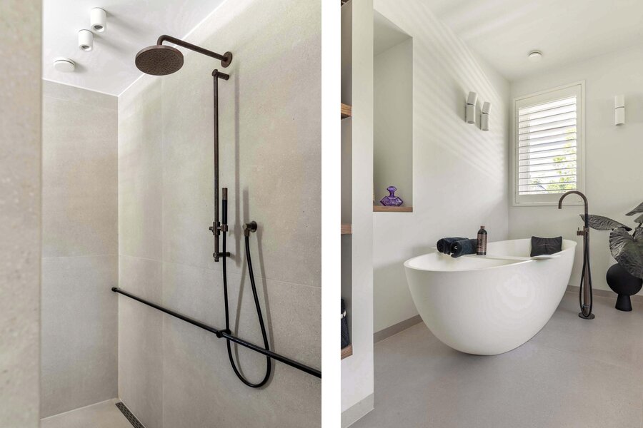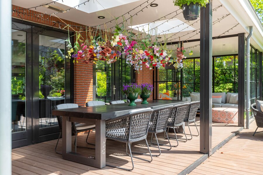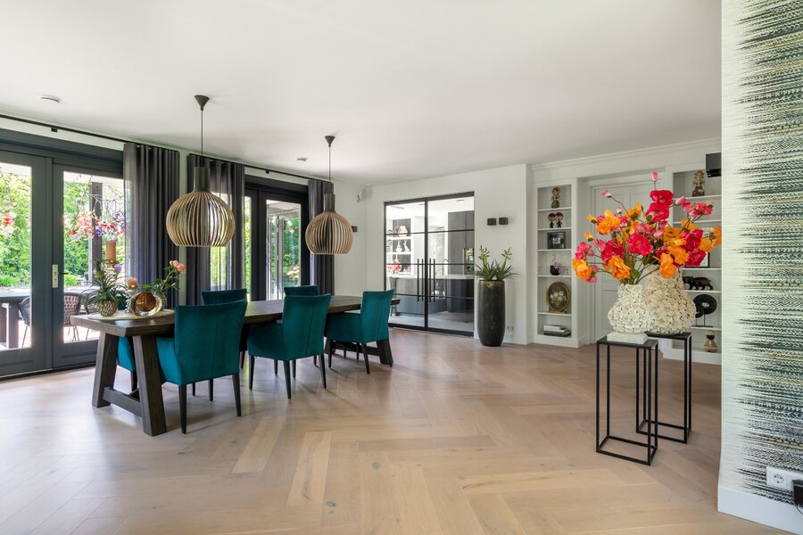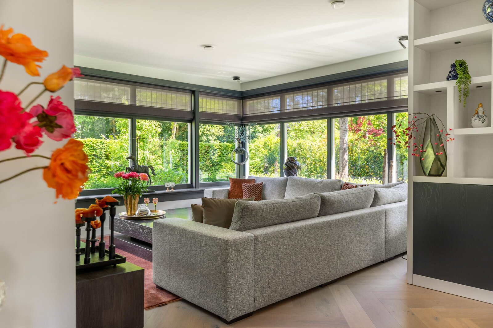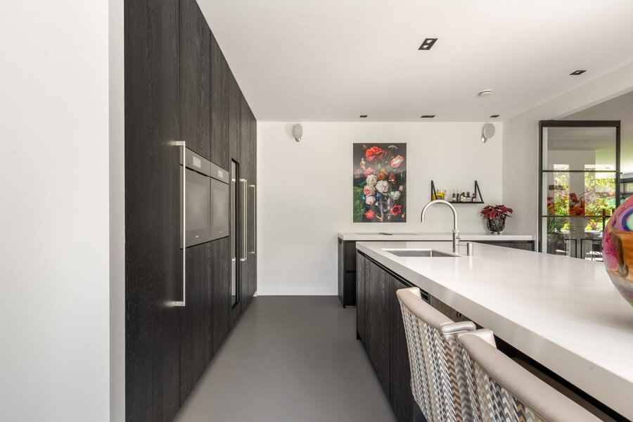 Through stylish steel pivot doors, you enter the modern kitchen, fitted with a sleek poured floor and underfloor heating. The kitchen can be closed off if desired, but also offers the possibility to maintain an open layout. It is fully equipped with an induction hob, Quooker, double dishwasher, spacious refrigerator, and a stylish wine climate cabinet. A seating area and double doors opening onto the garden and covered terrace (fitted with screens) ensure seamless indoor-outdoor living.