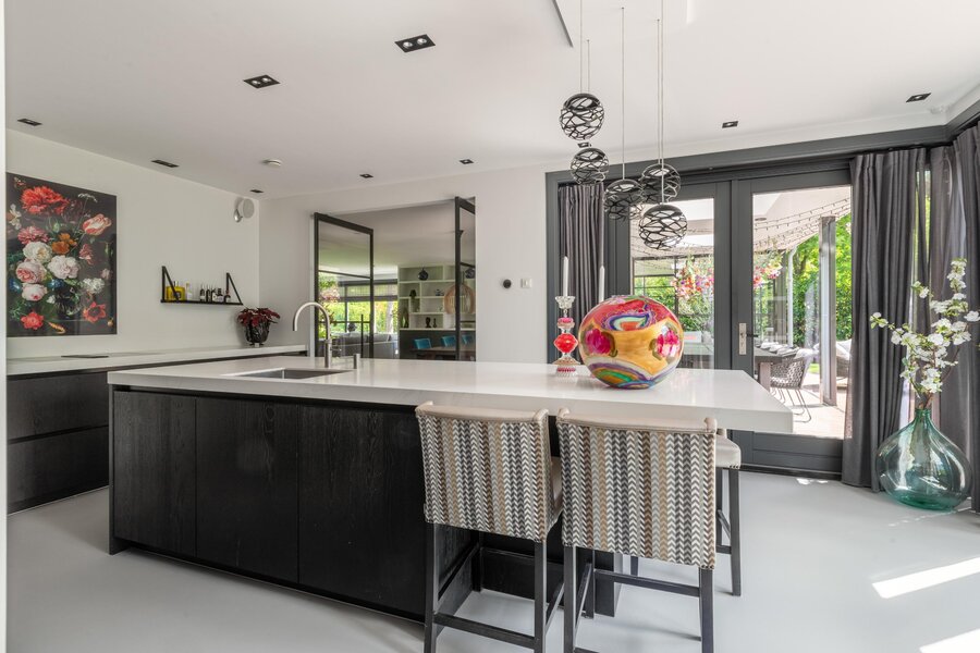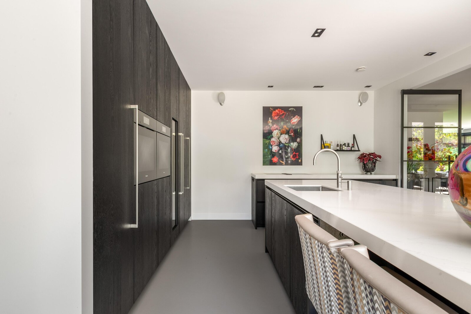 Via stijlvolle stalen taatsdeuren bereikt u de moderne leefkeuken, uitgevoerd met een strakke gietvloer en vloerverwarming. De keuken kan desgewenst worden afgesloten, maar biedt ook de mogelijkheid om het open karakter volledig te behouden. De keuken is compleet uitgerust met onder andere een inductiekookplaat, Quooker, dubbele vaatwasser, ruime koelkast en een stijlvolle wijnklimaatkast. Een zitgedeelte en dubbele openslaande deuren naar de tuin en overkapping (voorzien van hor) zorgen ervoor dat binnen- en buitenleven naadloos in elkaar overlopen.