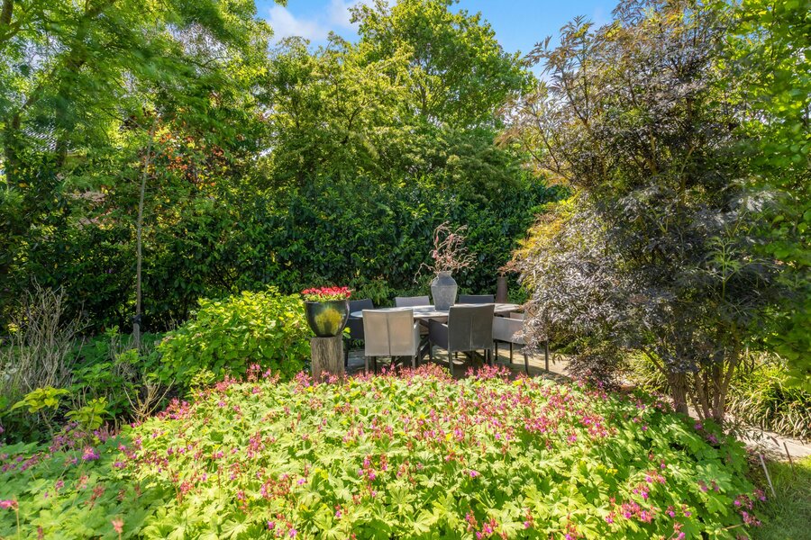 De zonnige achtertuin op het zuiden is fraai aangelegd en biedt meerdere zitplekken. Of u nu kiest voor het open terras of de stijlvolle serre met glazen wanden: hier geniet u in alle rust en privacy. Dankzij de ingebouwde heaters is het ook in de koelere maanden comfortabel vertoeven. Daarnaast beschikt de tuin over een royale vrijstaande houten berging met fietsenoverkapping.