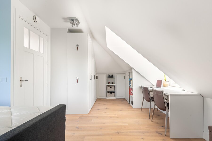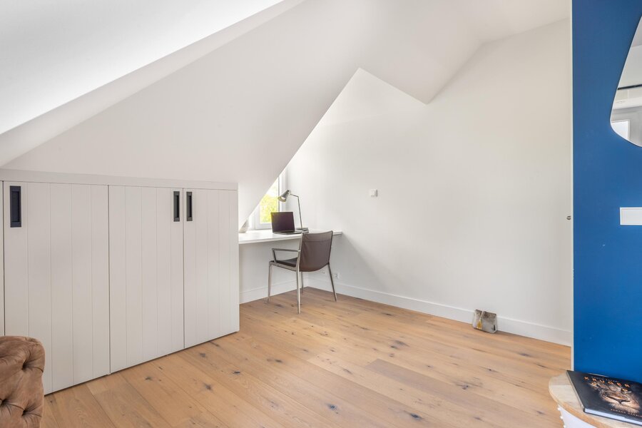 Aansluitend bevindt zich een multifunctionele kamer, momenteel ingericht als kantoor. Dankzij de prettige lichtinval en de ligging op de begane grond is deze ruimte ook uitstekend geschikt als slaapkamer, waarmee de woning eenvoudig levensloopbestendig is.