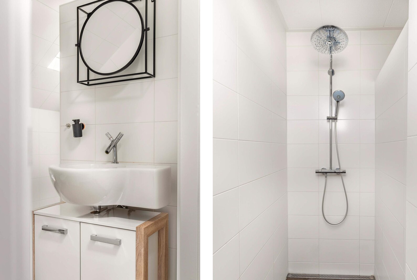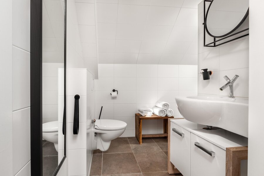A stately staircase leads to the upper floors. The first floor houses a generous master bedroom with an adjoining luxury walk-in closet, which can easily be converted into an additional bedroom if desired. There is also a second bedroom, a spacious laundry room, a separate toilet, and a luxury bathroom with a bathtub. Both bathrooms and the laundry room feature underfloor heating.