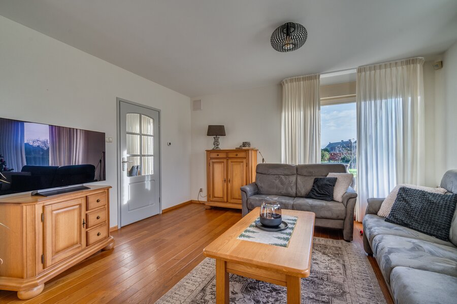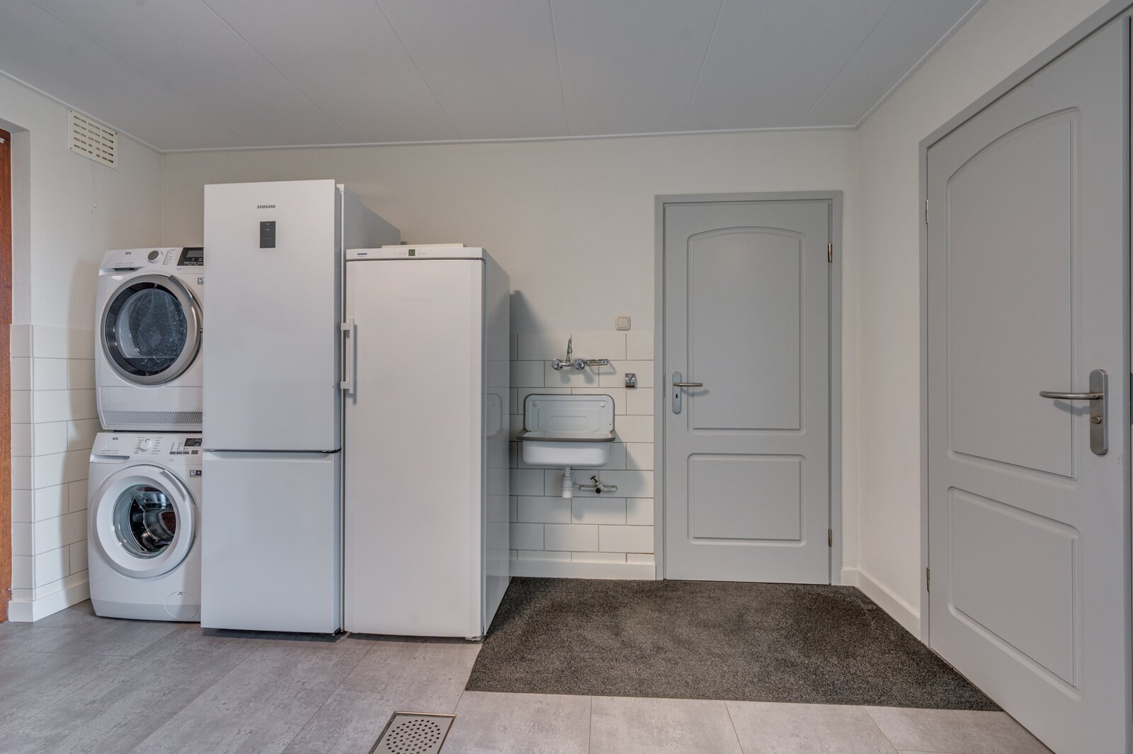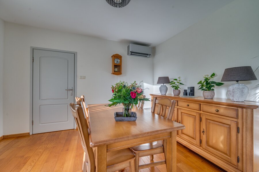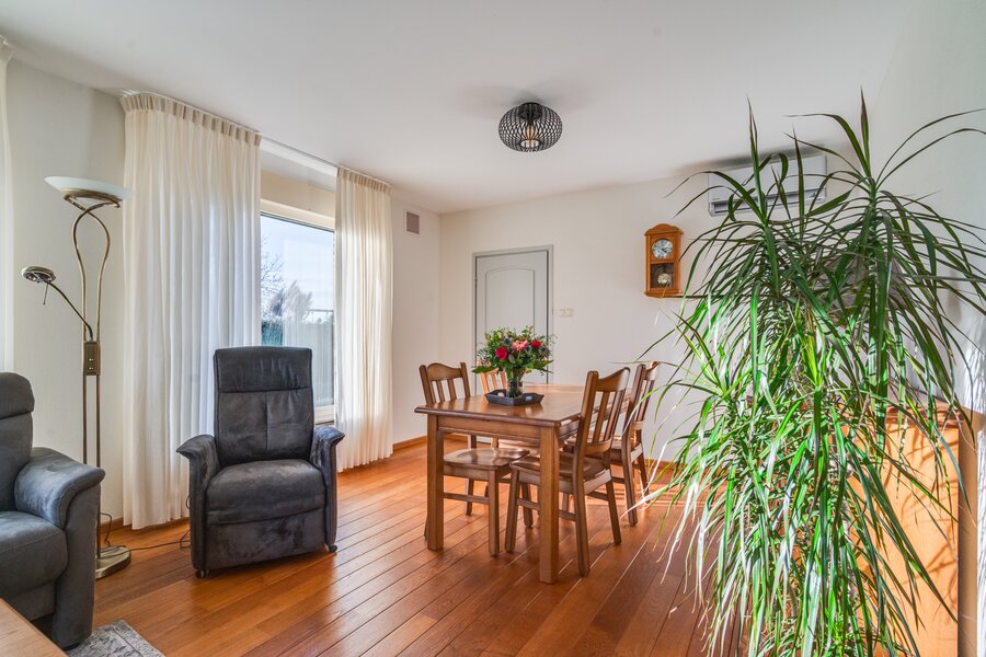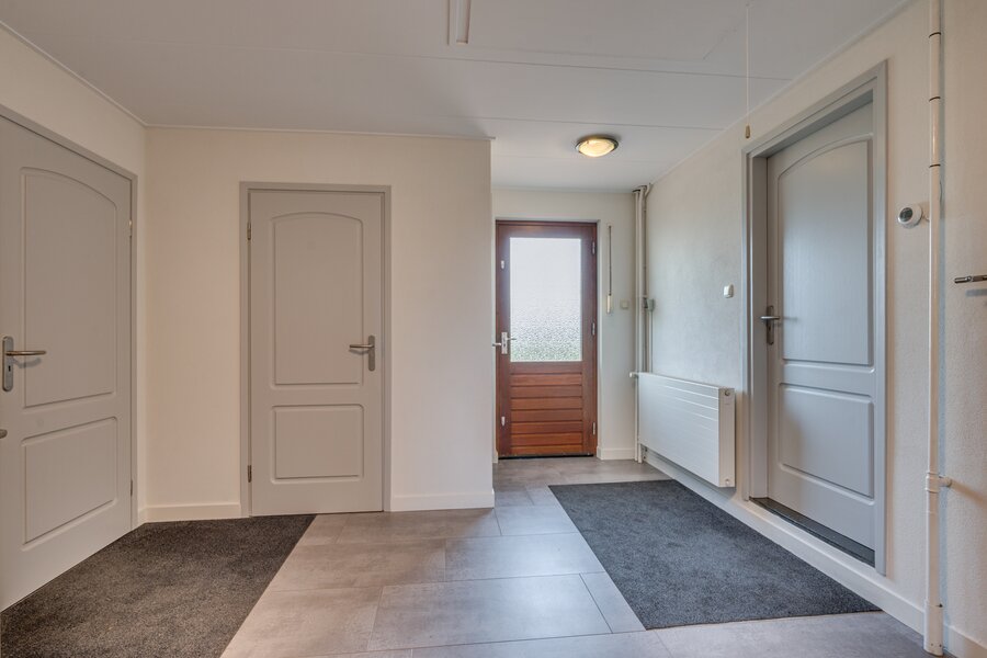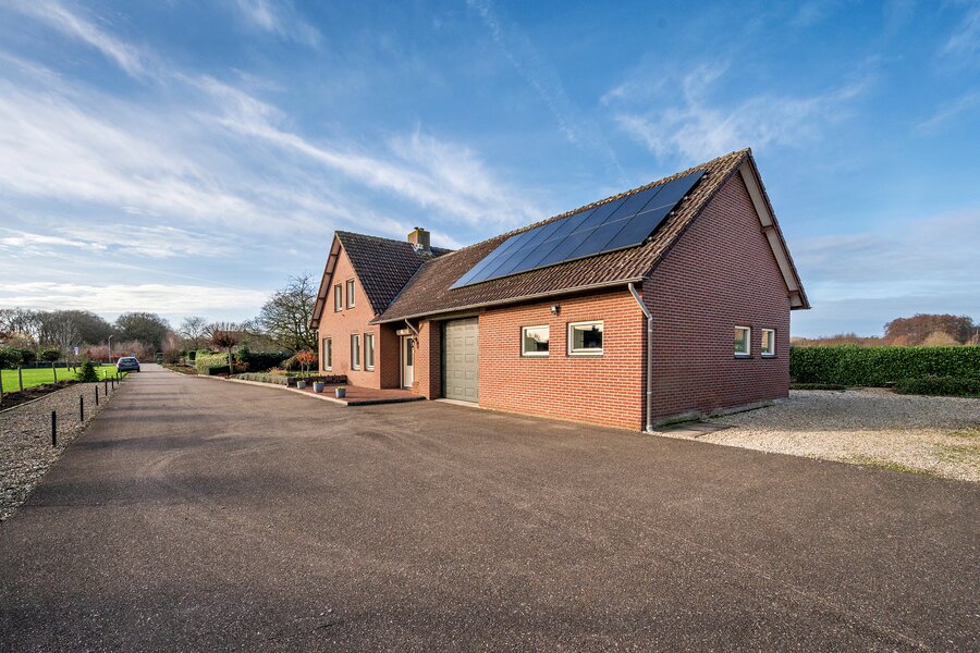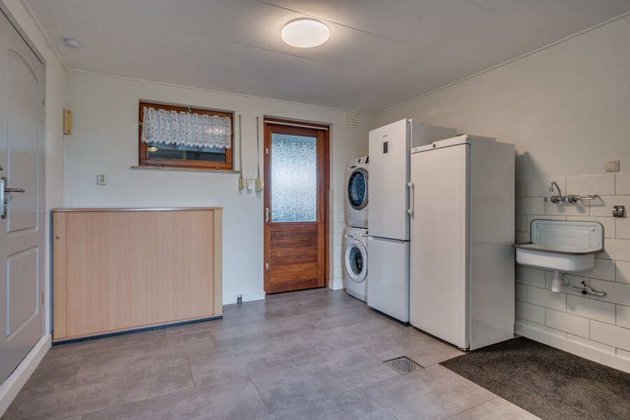 Middels een eigen weg is de woning te bereiken. Via een beklinkerd looppad is de entree van de woning te bereiken. De ontvangsthal geeft toegang tot de garderobe, meterkast, woonkamer, slaapkamer en trapopgang naar de 1e verdieping. De woonkamer welke is voorzien van een eikenhoutenvloer en airco geniet veel lichtinval door de vele raampartijen en geeft toegang tot de leefkeuken. De keuken is ruim van opzet en beschikt over een PVC vloer, composiet aanrechtblad, inductiekookplaat, afzuigkap, vaatwasmachine, koelkast en een combioven/ magnetron. Middels een loopdeur is de keuken is er toegang tot de bijkeuken. De bijkeuken is tevens voorzien van een PVC vloer en is voorzien van de witgoedaansluitingen, cv-ketel (Nefit 2024), separate toiletruimte welke geheel is betegeld en voorzien van een zwevend toilet, fontein en buitenraam. De bijkeuken heeft verder een loopdeur naar de badkamer op de begane grond, loopdeur naar de serre, garage en voorzijde. Verder is er een vlizotrap welke toegang geeft tot de zolder, hier is tevens de omvormer van de 14 zonnepanelen geplaatst.