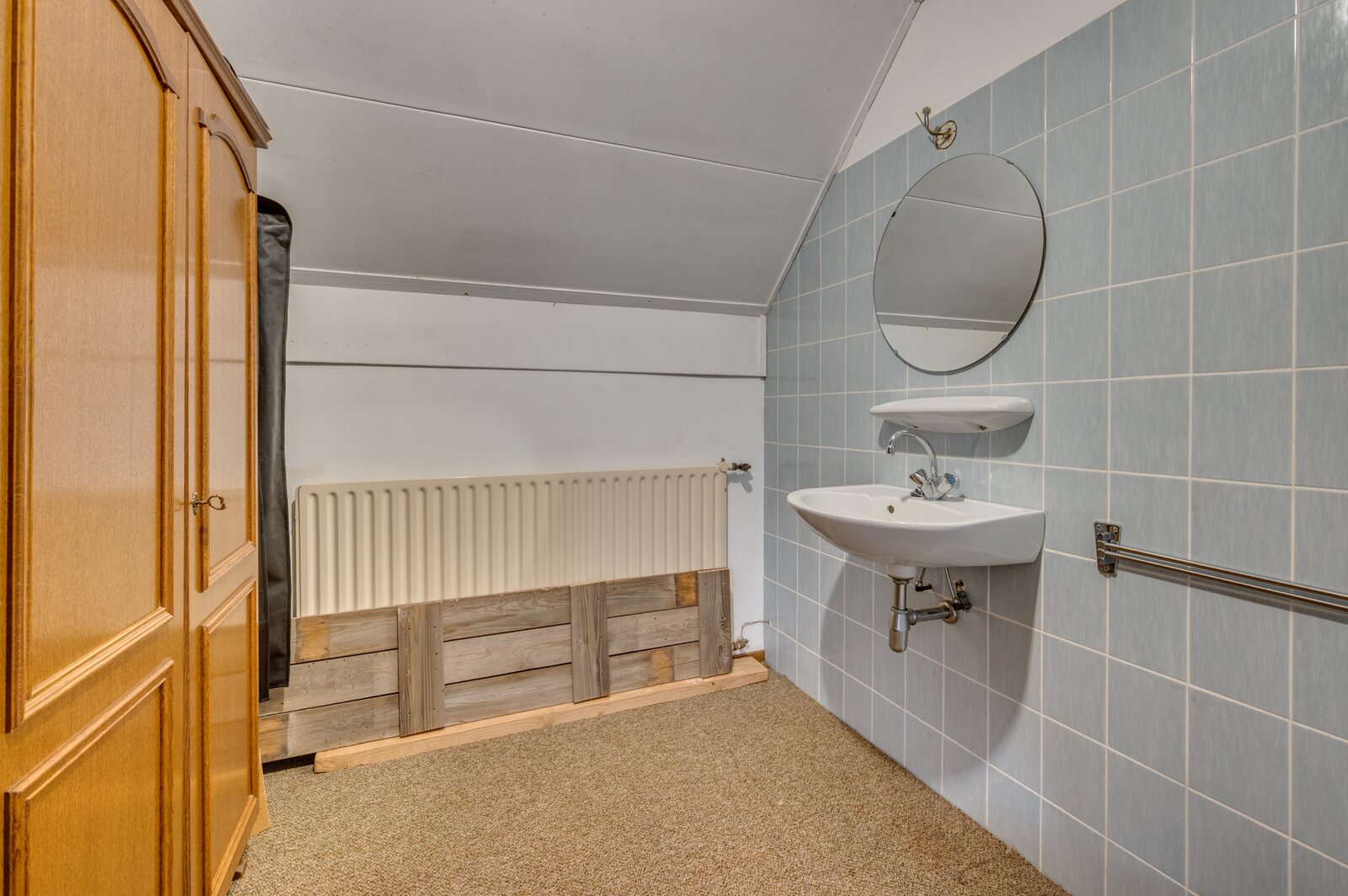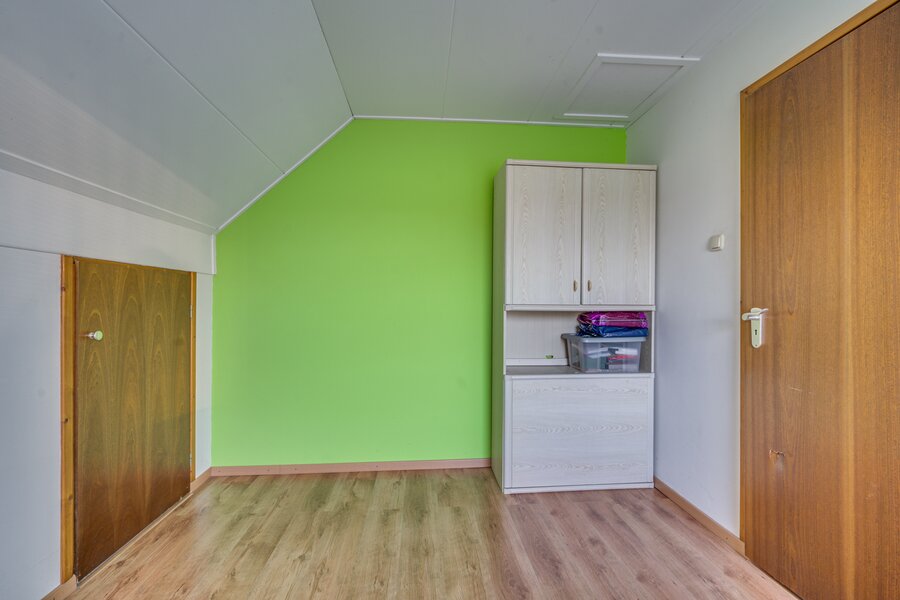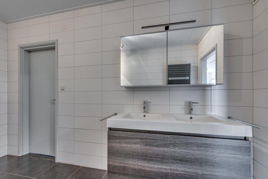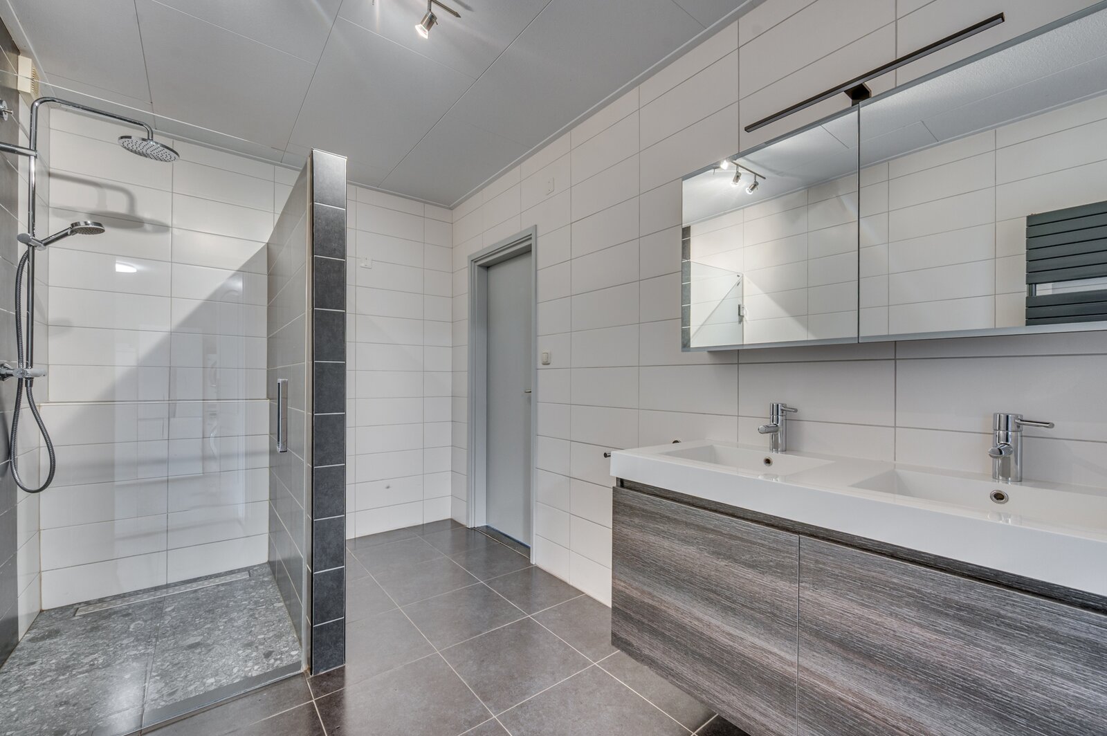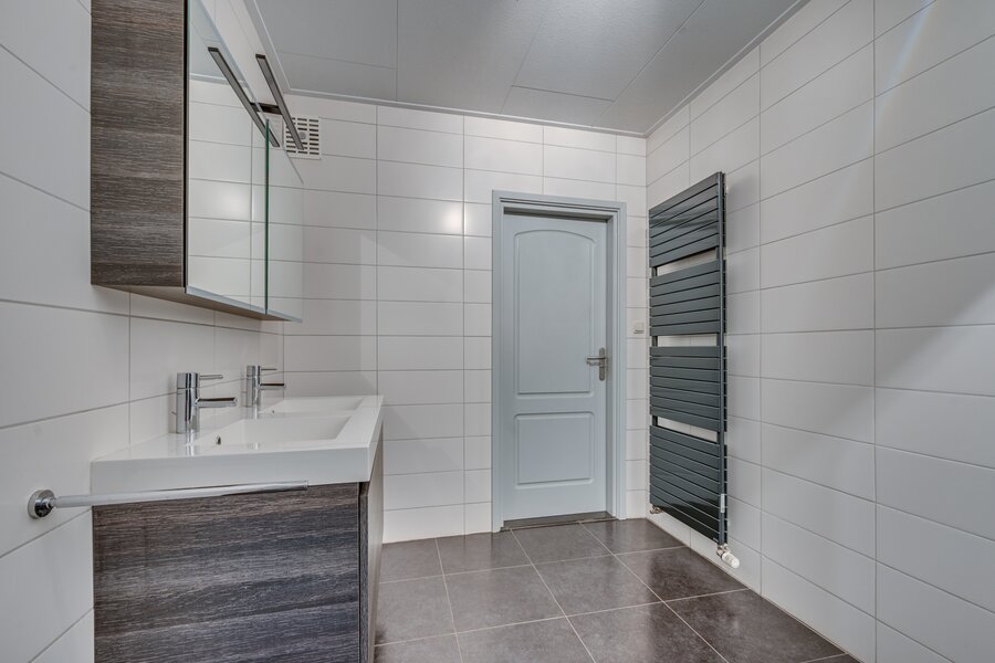 De overloop geeft toegang tot 3 slaapkamers, separate toiletruimte en badkamer. Alle 3 de slaapkamers beschikken over opbergruimte, rolluiken en zijn voorzien van een laminaatvloer. De separate toiletruimte is deels betegeld en voorzien van een toilet met Sanibroyeur en fontein. De badkamer beschikt over een douche en wastafel en is zeer ruim van opzet.