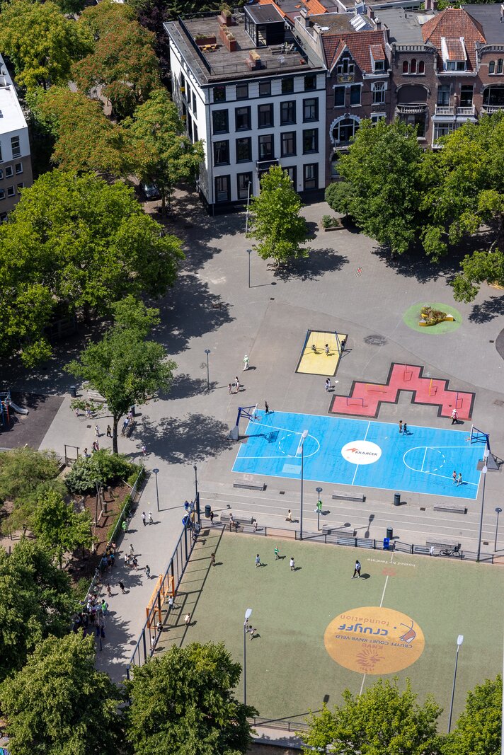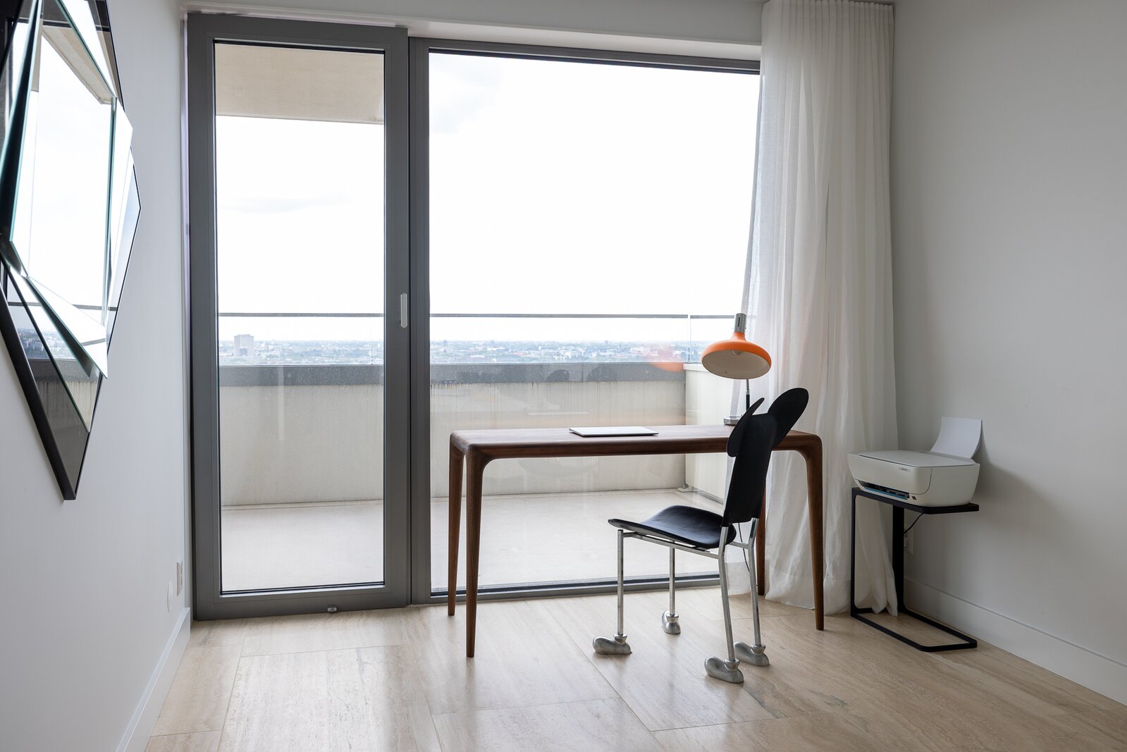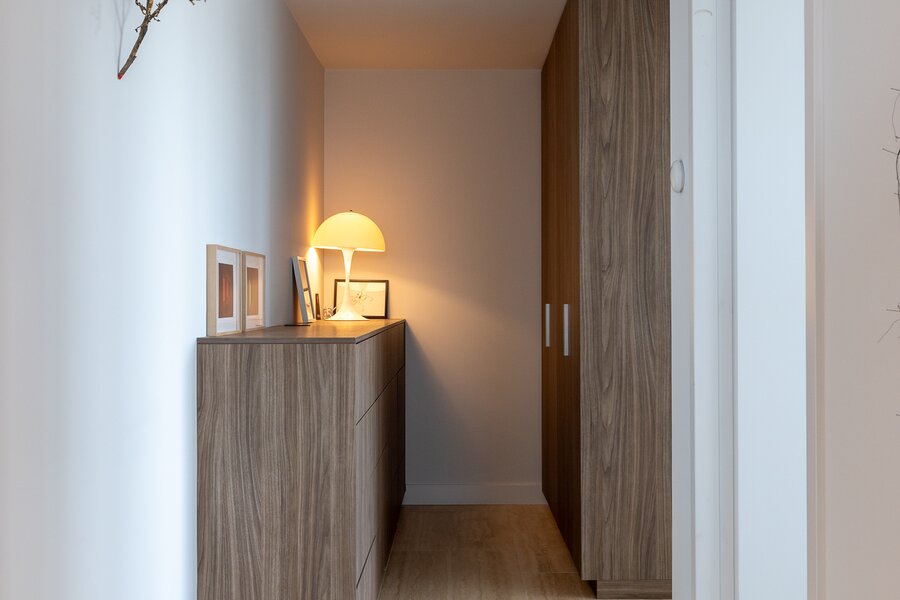 Dankzij de ligging op de hoek en de verdiepingshoge raampartijen is het appartement uitzonderlijk licht en ruimtelijk. De indeling is doordacht en comfortabel met onder andere een royale living, een luxe keuken met kookeiland, een werkkamer, twee slaapkamers en een badkamer die aan alle moderne eisen voldoet. De buitenruimte bestaat uit twee zonnige terrassen met toegang vanuit zowel de woonkamer als de werkkamer – perfect gepositioneerd om te genieten van middag- en avondzon én van het dynamische uitzicht op de stad.