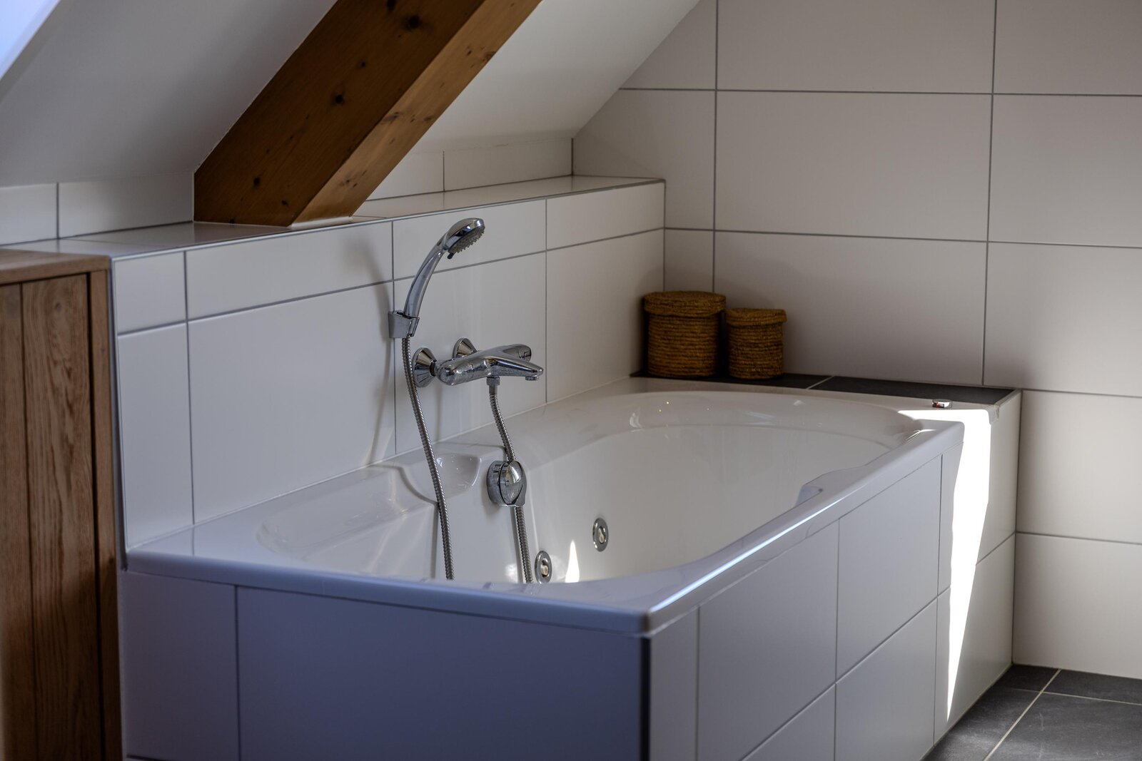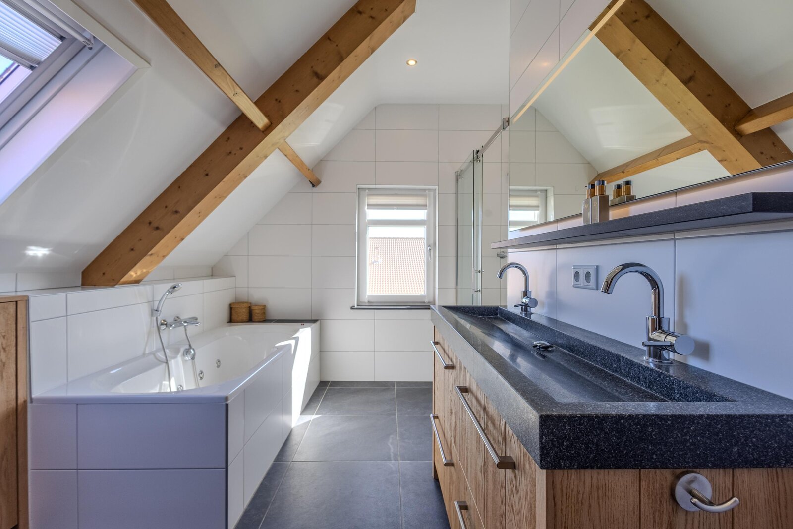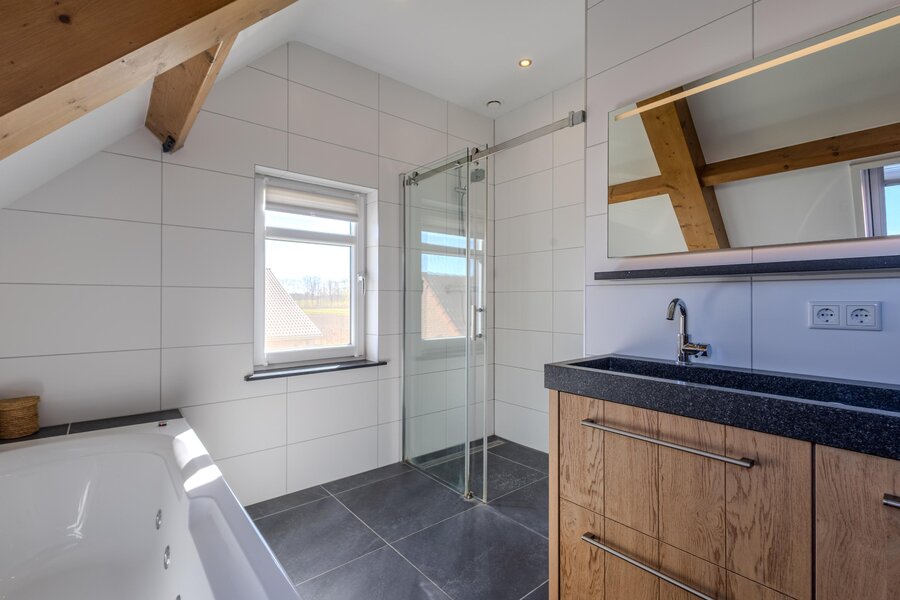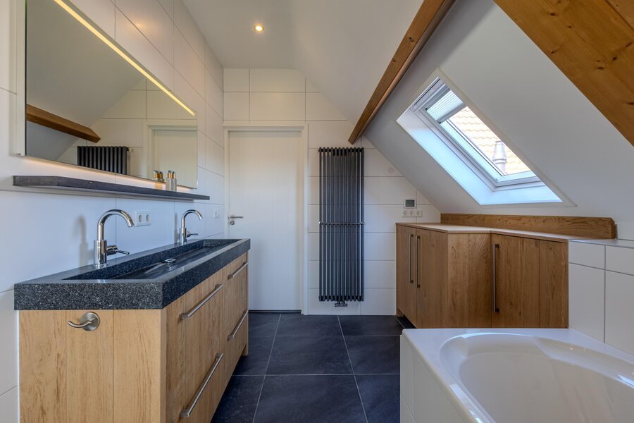 De badkamer is compleet en modern afgewerkt, met een ligbad met whirlpool, een inloopdouche en een dubbele wastafel met meubel en spiegel voorzien van geïntegreerde verlichting. De wanden zijn volledig betegeld in een rustige, neutrale tint. Inbouwspots, een designradiator en vloerverwarming dragen bij aan het comfort. Het separate toilet ligt direct naast de badkamer.