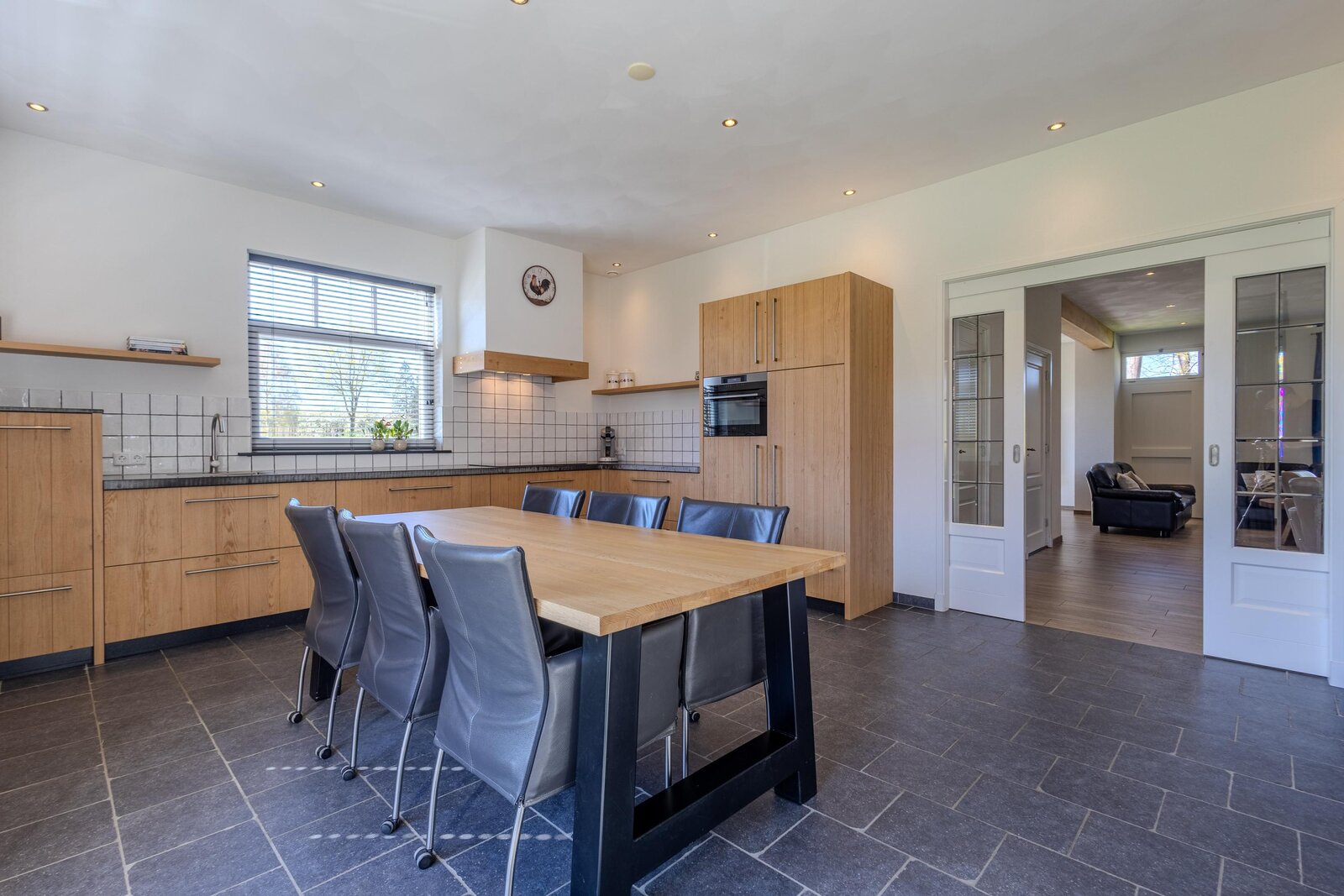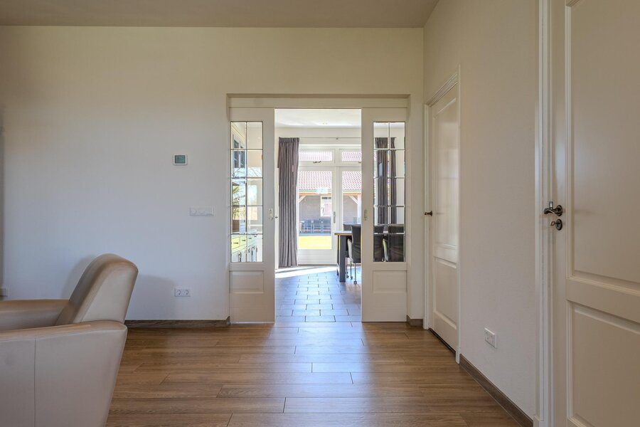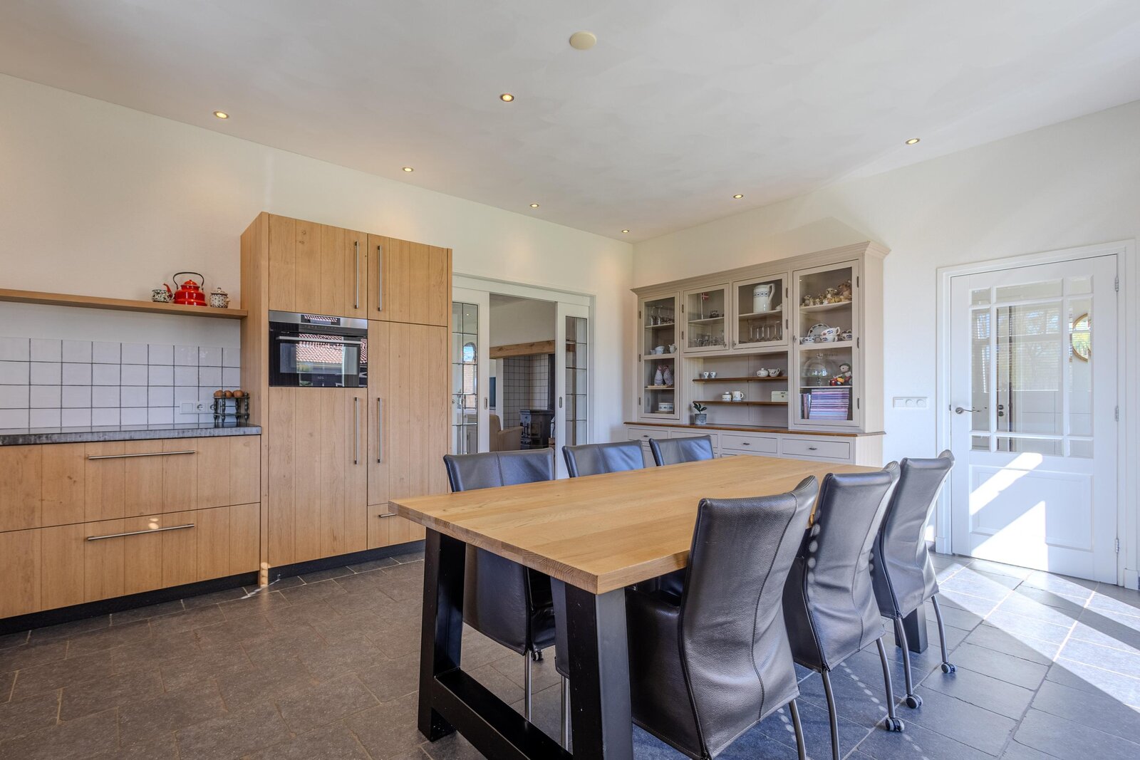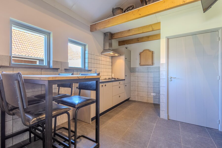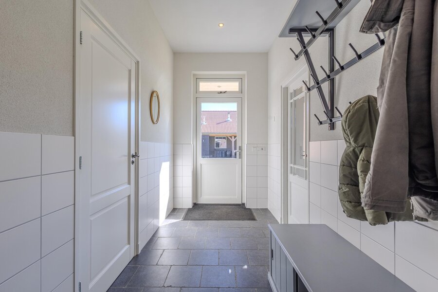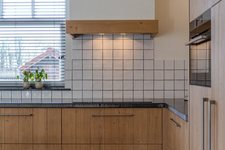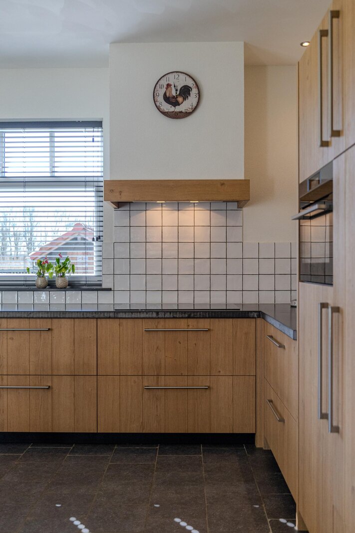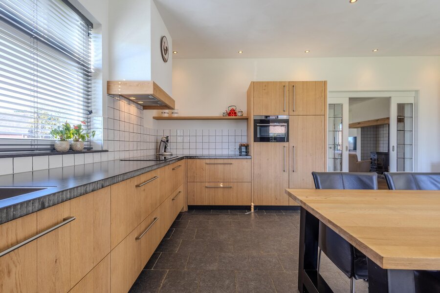 Via een loopdeur aan de achterzijde betreedt u de bijkeuken, waar ruimte is voor de garderobe en waar tevens het toilet met fonteintje en een separate wasruimte zijn gesitueerd. Vanuit hier loopt u door naar de woonkeuken, het kloppend hart van de woning. De keuken is ruim opgezet en uitgevoerd in een hoekopstelling, voorzien van diverse inbouwapparatuur zoals een inductiekookplaat met afzuigkap, koelkast, combi-oven en een vaatwasser op hoogte. De eikenfineer kastfronten zorgen voor een warme uitstraling, terwijl de vele kasten volop bergruimte bieden. Inbouwspots, een moderne tegelvloer met vloerverwarming en dubbele deuren naar de achtertuin maken dit tot een comfortabele en uitnodigende leefruimte.