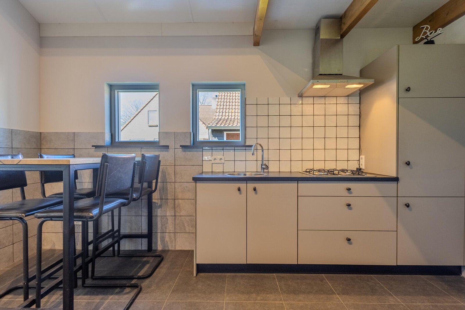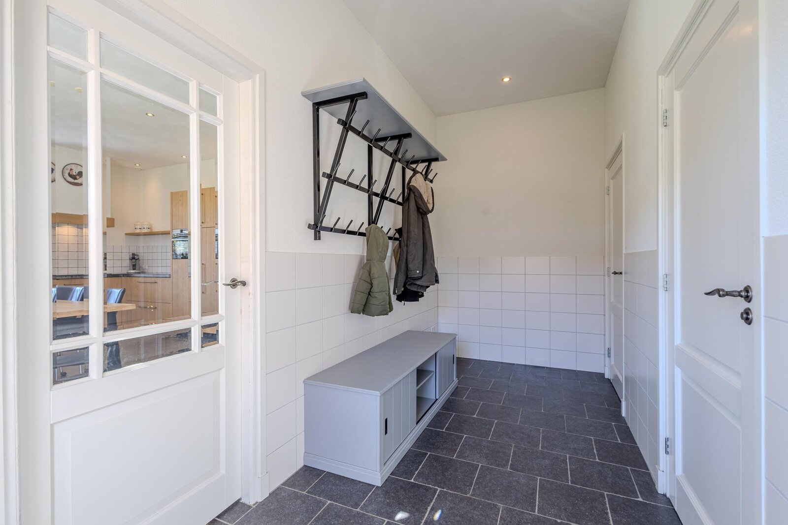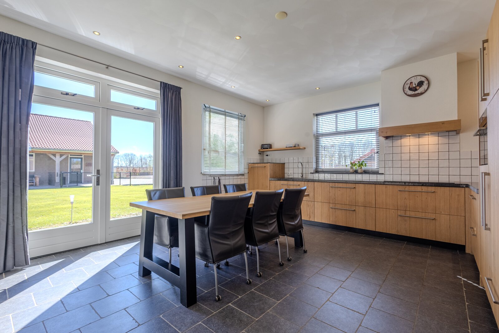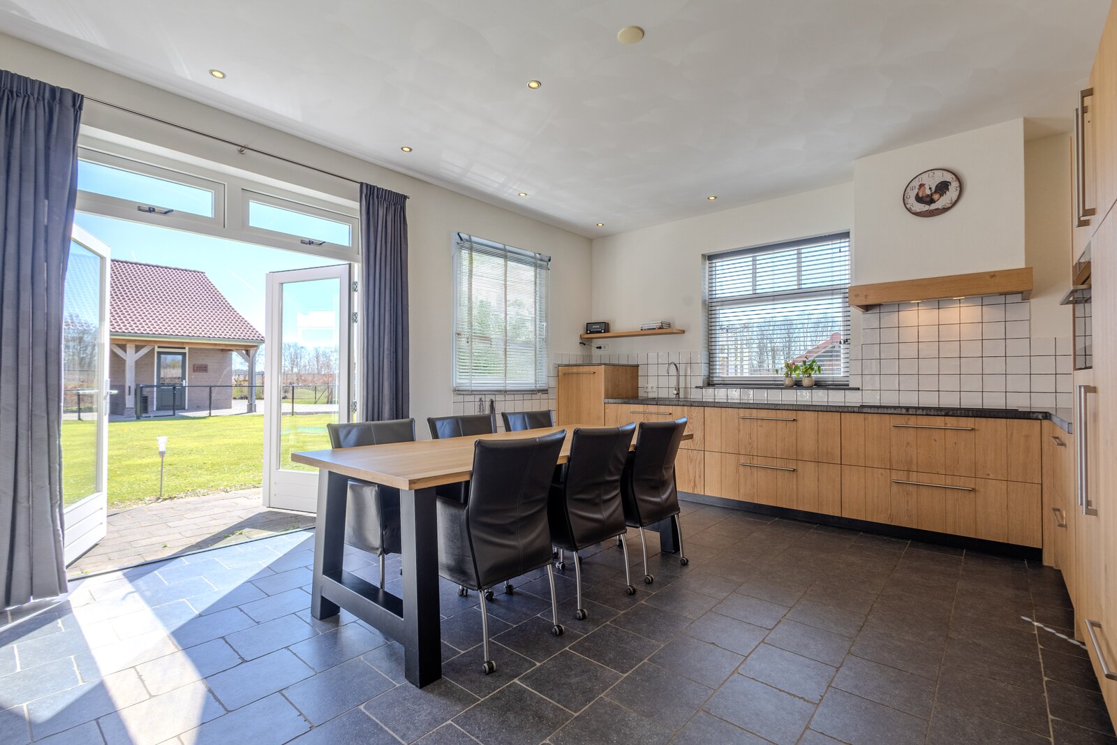 Via een loopdeur aan de achterzijde betreedt u de bijkeuken, waar ruimte is voor de garderobe en waar tevens het toilet met fonteintje en een separate wasruimte zijn gesitueerd. Vanuit hier loopt u door naar de woonkeuken, het kloppend hart van de woning. De keuken is ruim opgezet en uitgevoerd in een hoekopstelling, voorzien van diverse inbouwapparatuur zoals een inductiekookplaat met afzuigkap, koelkast, combi-oven en een vaatwasser op hoogte. De eikenfineer kastfronten zorgen voor een warme uitstraling, terwijl de vele kasten volop bergruimte bieden. Inbouwspots, een moderne tegelvloer met vloerverwarming en dubbele deuren naar de achtertuin maken dit tot een comfortabele en uitnodigende leefruimte.