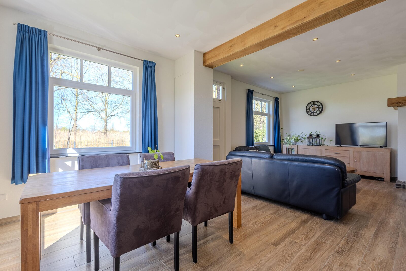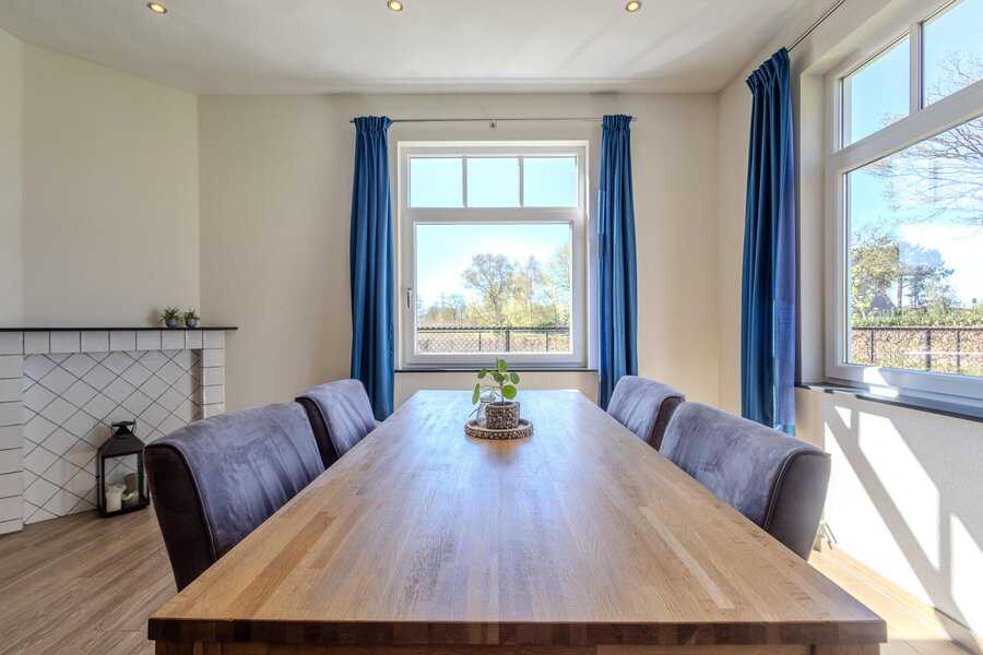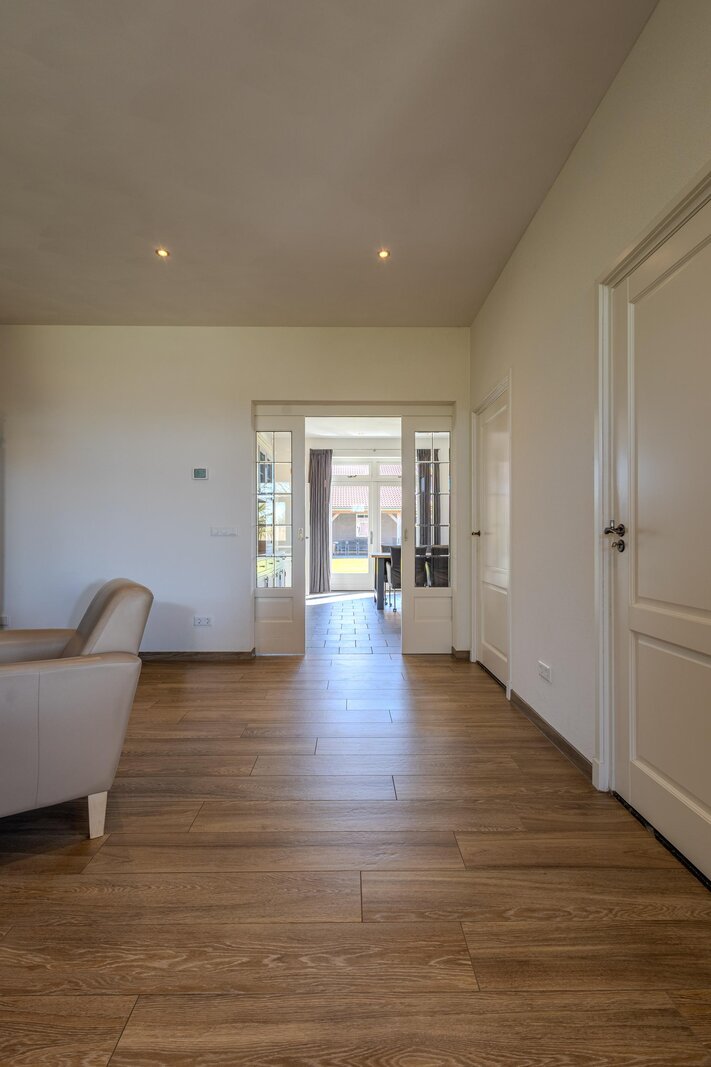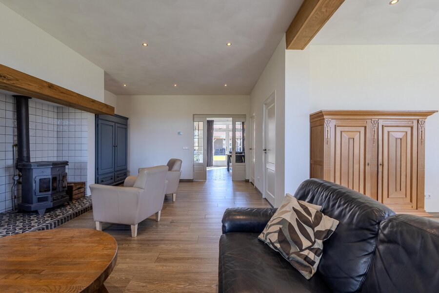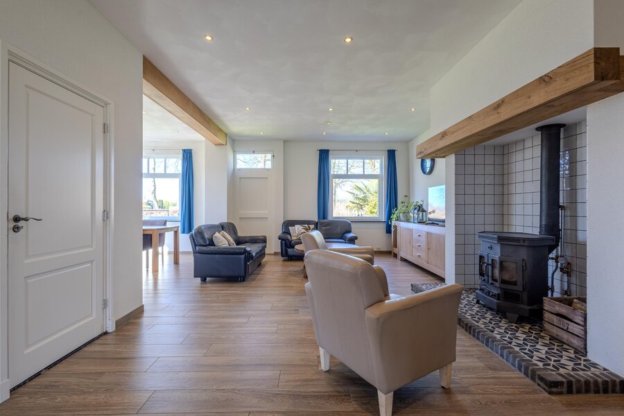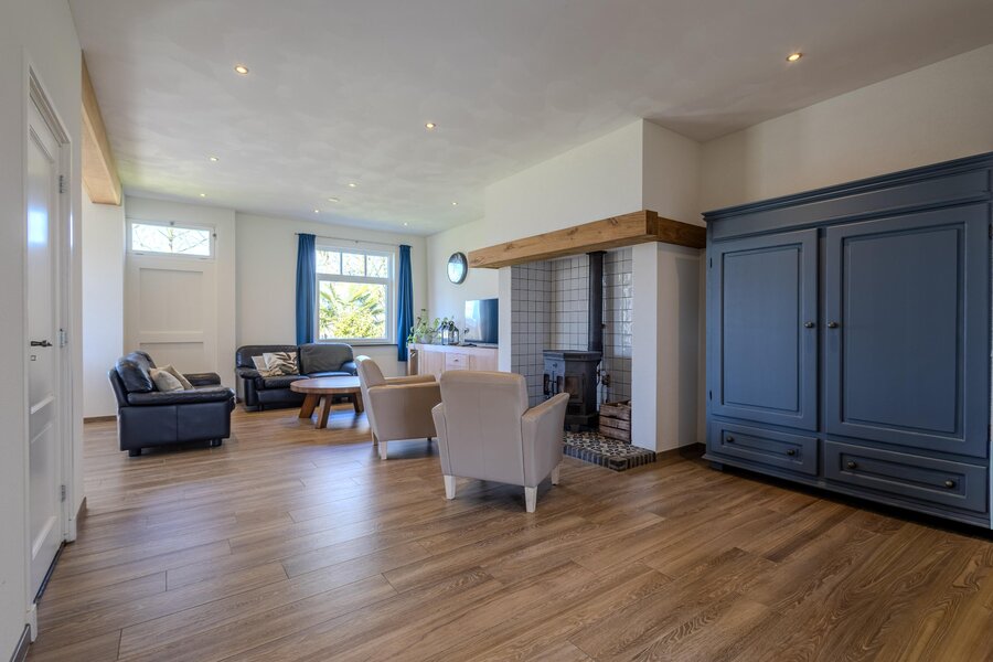 De open verbinding met de woonkamer zorgt voor een prettig geheel. Deze ruimte heeft een royaal formaat en laat zich flexibel indelen. De schouw bij de eethoek vormt een karaktervolle toevoeging, terwijl rondom de houtkachel een sfeervolle zitplek kan worden gecreëerd. De tegelvloer in houtlook met vloerverwarming draagt bij aan het comfort en de warme uitstraling. Naast de originele voordeur vindt u de meterkast.