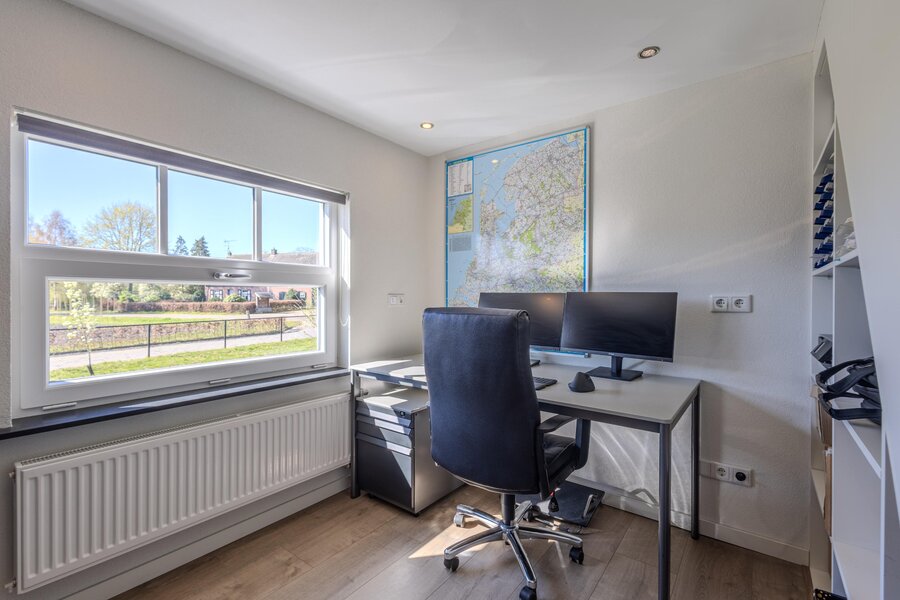 Achter een gesloten deur bevindt zich de trapopgang naar de eerste verdieping. Kenmerkend is hier de opkamer, momenteel ingericht als thuiskantoor, met een fraai uitzicht over de omliggende landerijen.