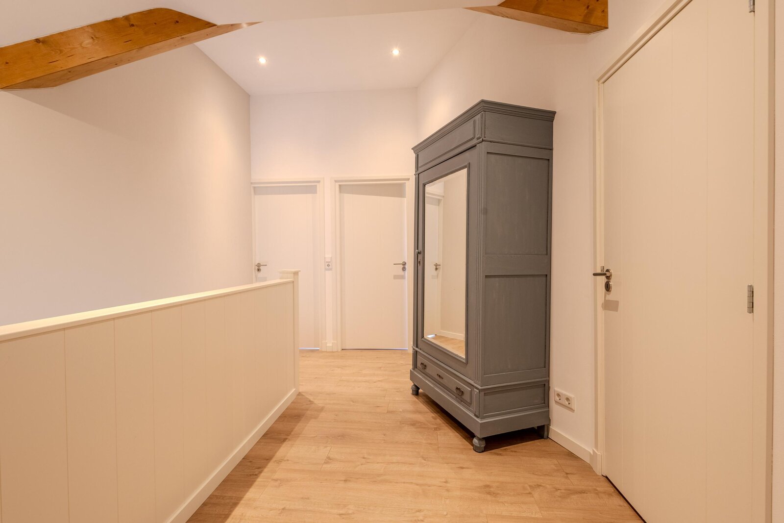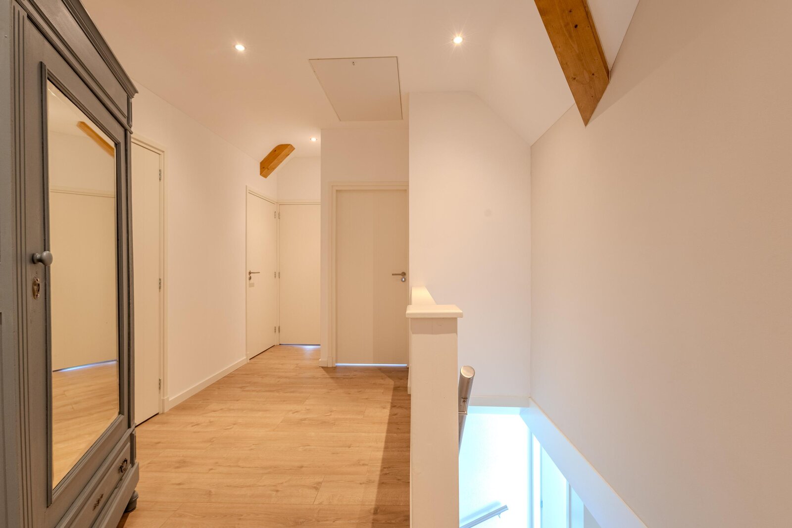 Via de trap bereikt u de overloop, die toegang biedt tot drie slaapkamers, een separaat toilet, de badkamer en een bergruimte.