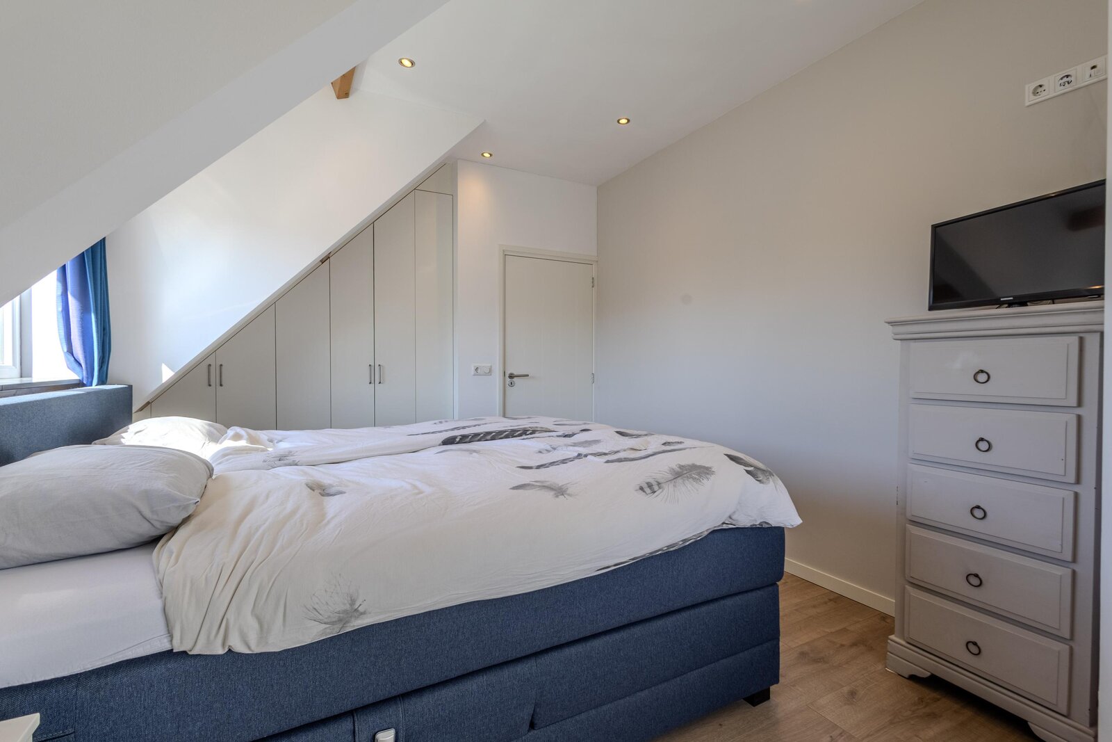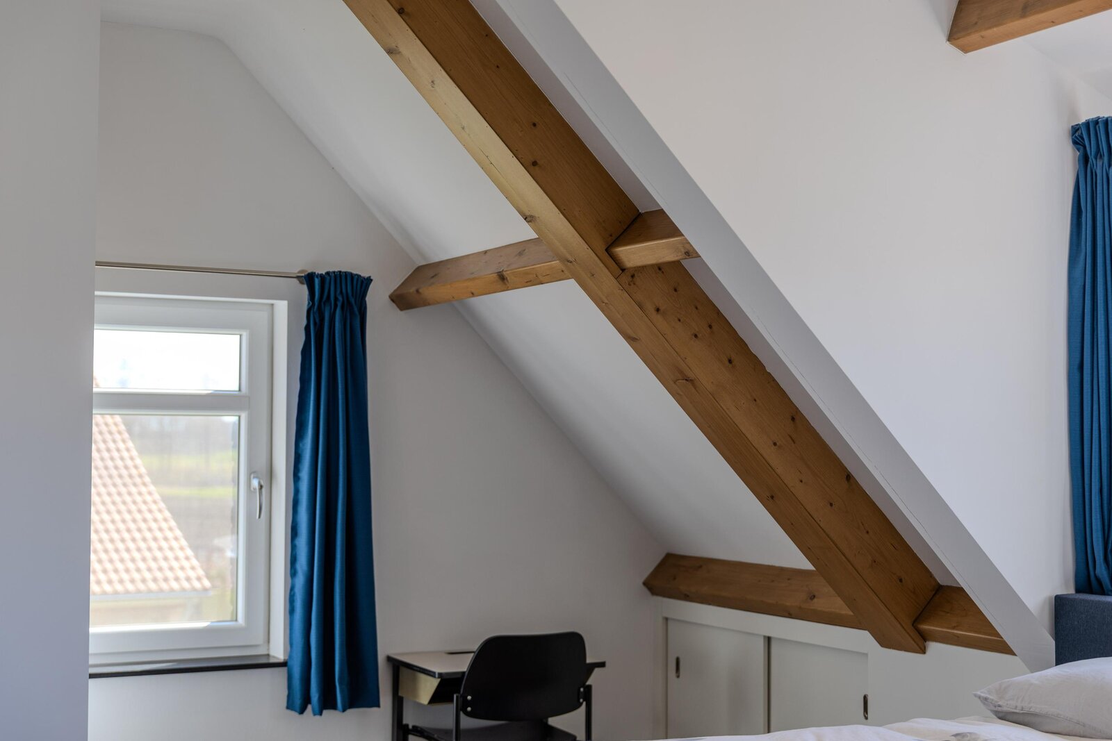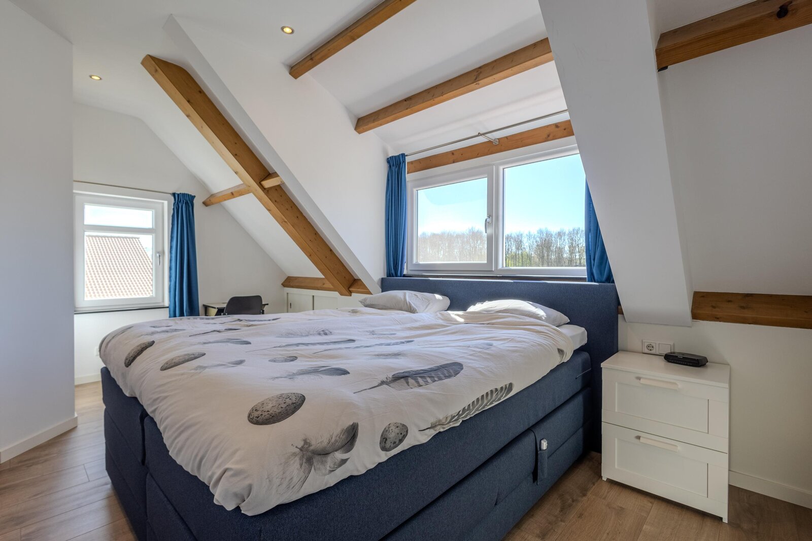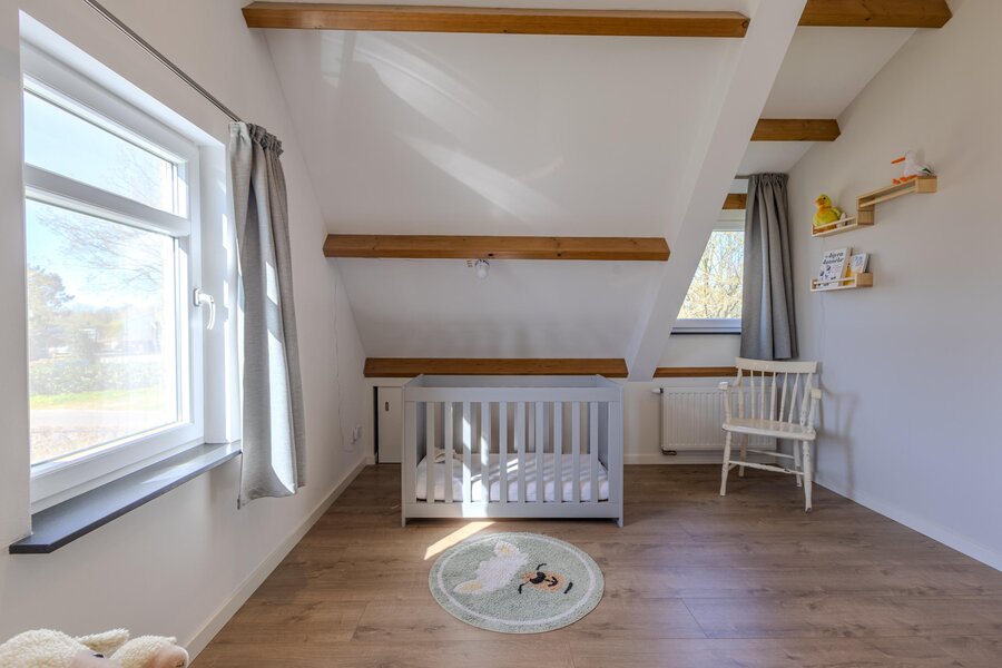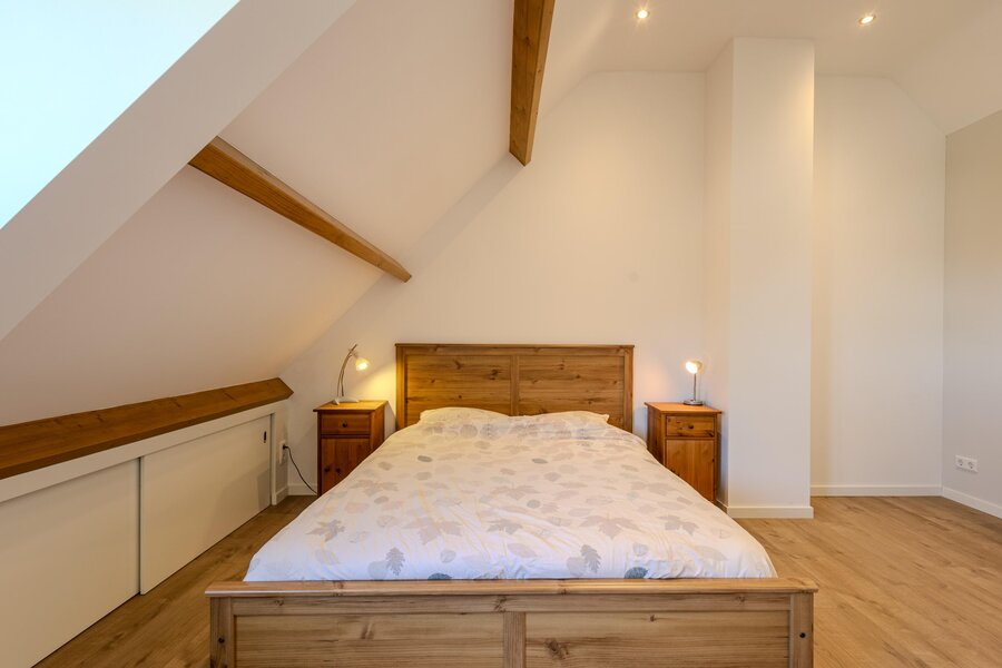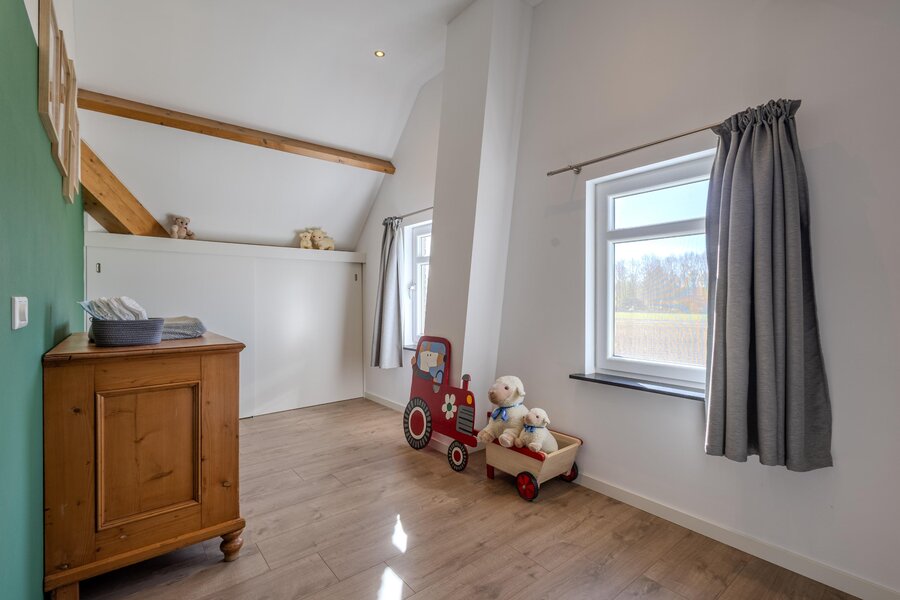 De tweede slaapkamer is royaal van opzet en voorzien van een dakkapel met een vrij en groen uitzicht. De hoge nok en speelse indeling versterken het ruimtelijke karakter van deze kamer.