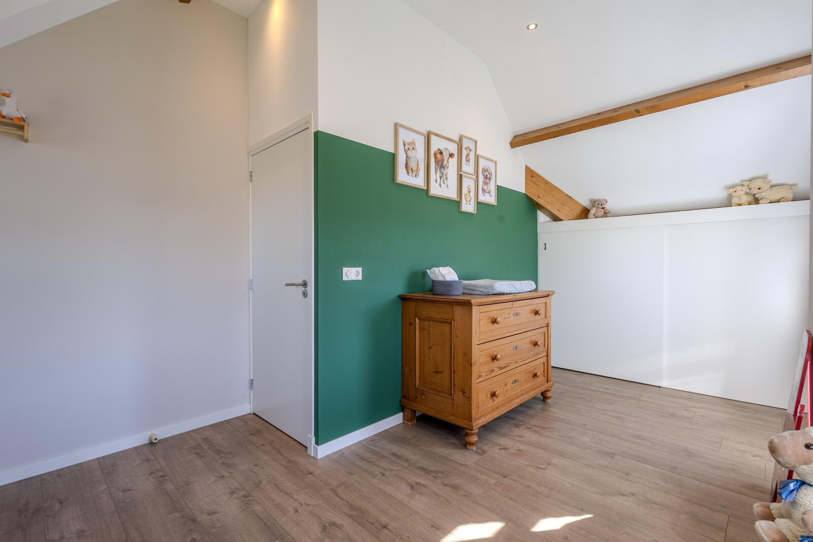 De eerste slaapkamer heeft een prettig formaat en wordt momenteel gebruikt als kinderslaapkamer. Onder de schuine kap is extra bergruimte aanwezig.