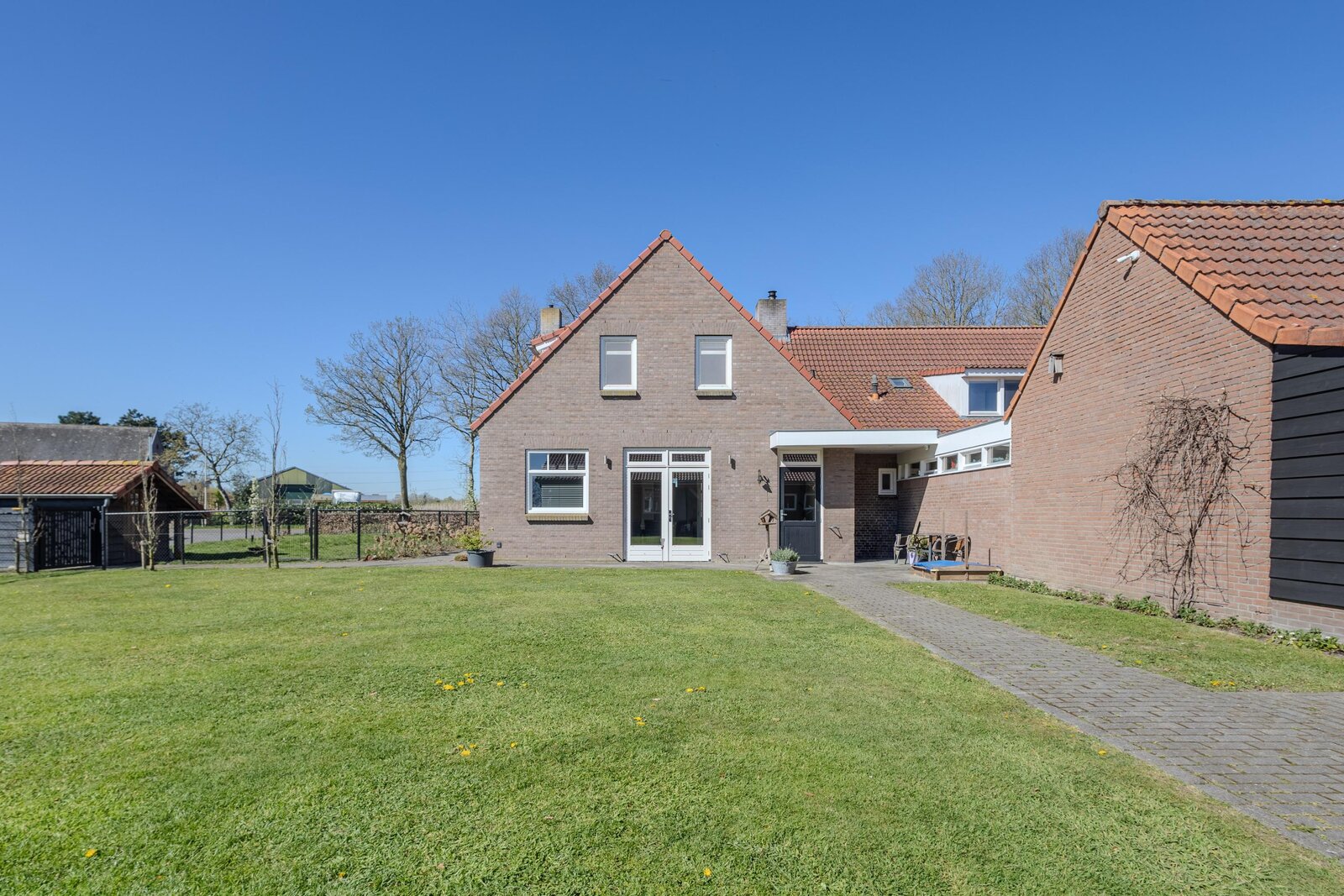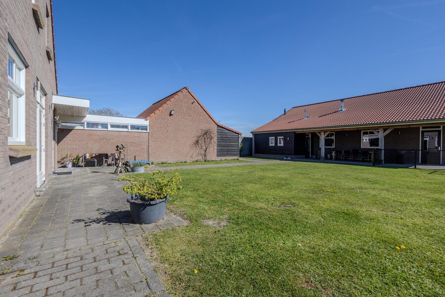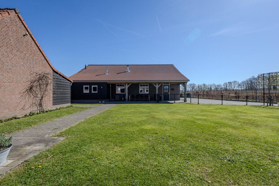 Direct achter de woning ligt een terras met een vrij uitzicht over de naastgelegen landerijen. Vanuit hier loopt u via een pad naar de vrijstaande loods met aangrenzende overkapping.