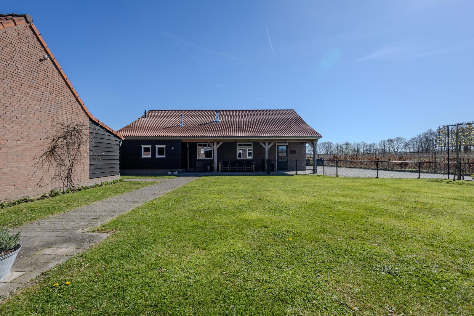 Aansluitend aan de voorzijde, richting het woonhuis, bevindt zich een ruime overkapping, waar moeiteloos met een groter gezelschap kan worden getafeld. De directe verbinding met de pantry maakt het ontvangen van gasten hier bijzonder comfortabel.