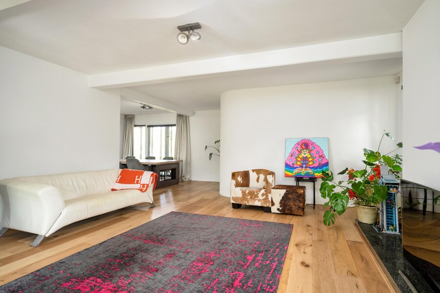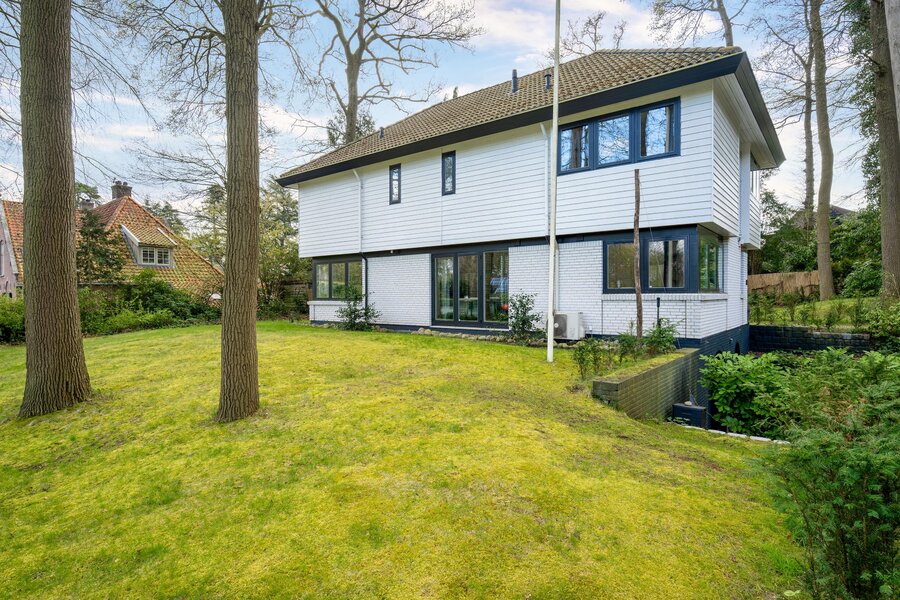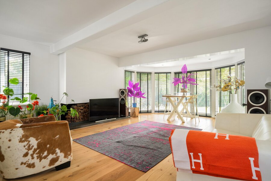 In an idyllic location on the edge of the Laarder Eng, you'll find this detached turnkey villa (1986) with 235 m² of living space on a lovely 1,238 m² plot. The villa, designed by architect Drabbe, features 4 spacious bedrooms, 3 bathrooms, and generous, bright living areas. Thanks to its open position, you'll enjoy fantastic views, optimal privacy, and low energy costs. A wonderful family home on a quiet, popular lane near the heart of Laren.