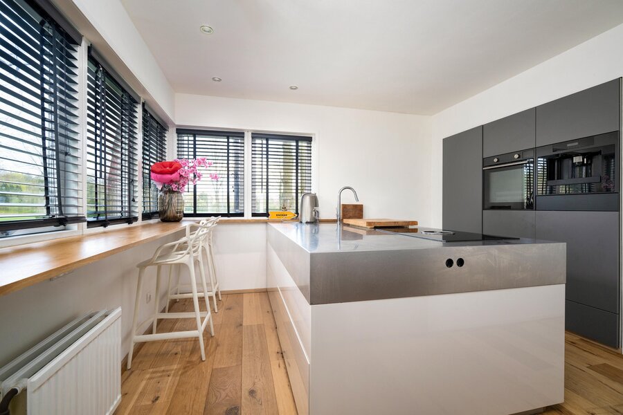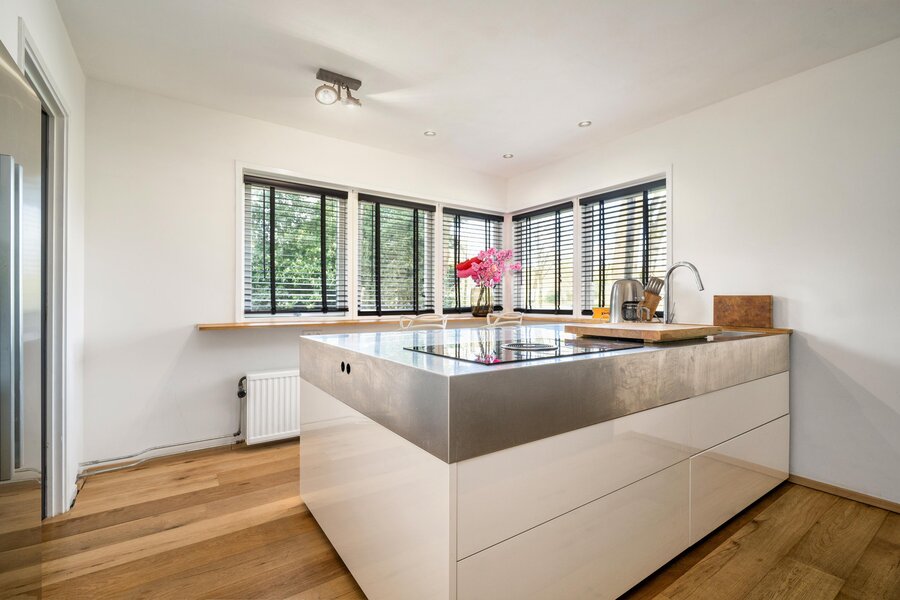 De entree straalt direct klasse uit. Een ruime hal met hoge lichte vide, garderobe, toilet en moderne afwerking leidt naar de indrukwekkende living en keuken van circa 100 m². Aan de tuinzijde bevindt zich de woonkamer, voorzien van een gezellige open haard en een serre met dubbele deuren. Vanuit de eethoek leiden eveneens dubbele deuren naar de groene buitenruimte. Door de glazen deur is er een aparte, lichte ruimte die nu in gebruik is als kantoor, maar ook perfect geschikt is als speelkamer of tv-kamer. De keuken is voorzien van een kookeiland en uitgerust met alle denkbare inbouwapparatuur, waaronder een vaatwasser, koffieautomaat, stoomoven en Bora BFIU inductieplaat.