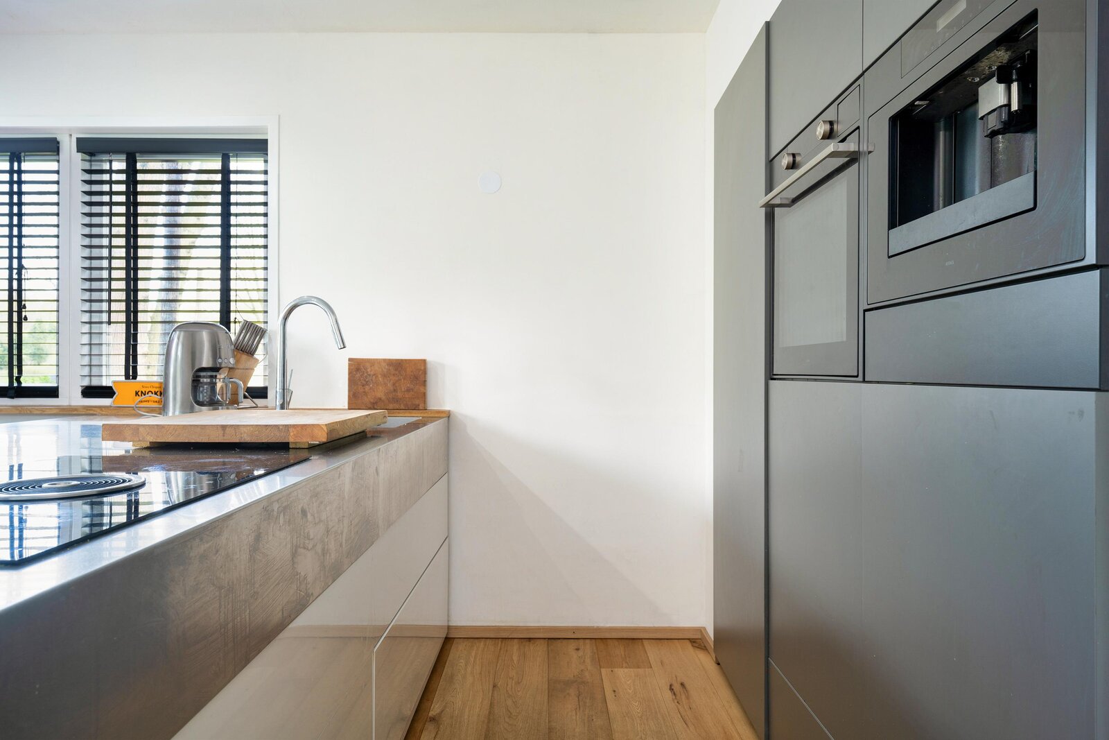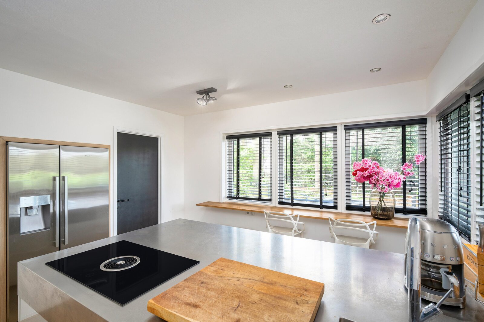 The kitchen features an island and is equipped with all conceivable built-in appliances, including a dishwasher, coffee machine, steam oven, and Bora BFIU induction hob.
