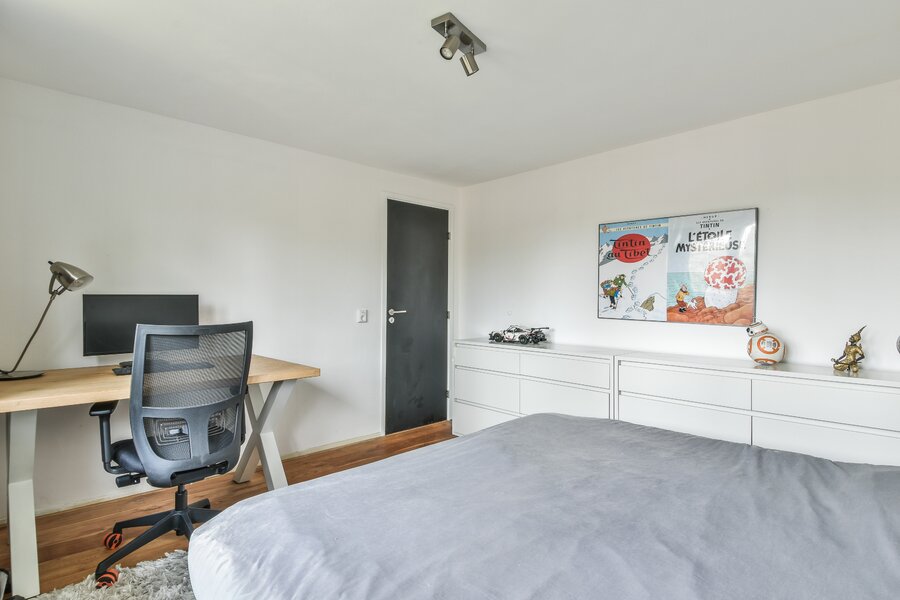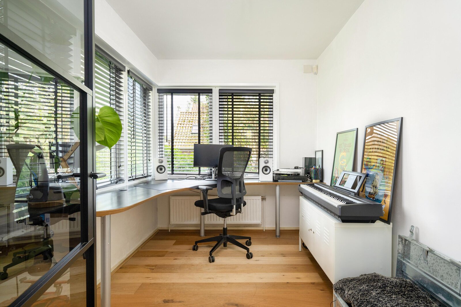 Through the glass door adjoining the living room, there is a separate, bright room that is currently used as an office, but is also perfect as a playroom or tv-room.