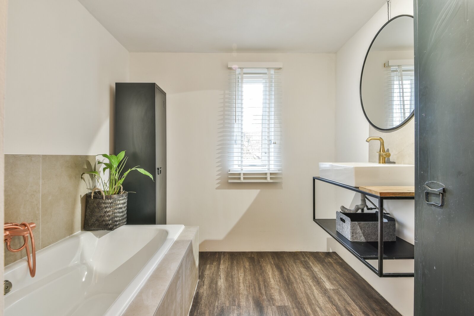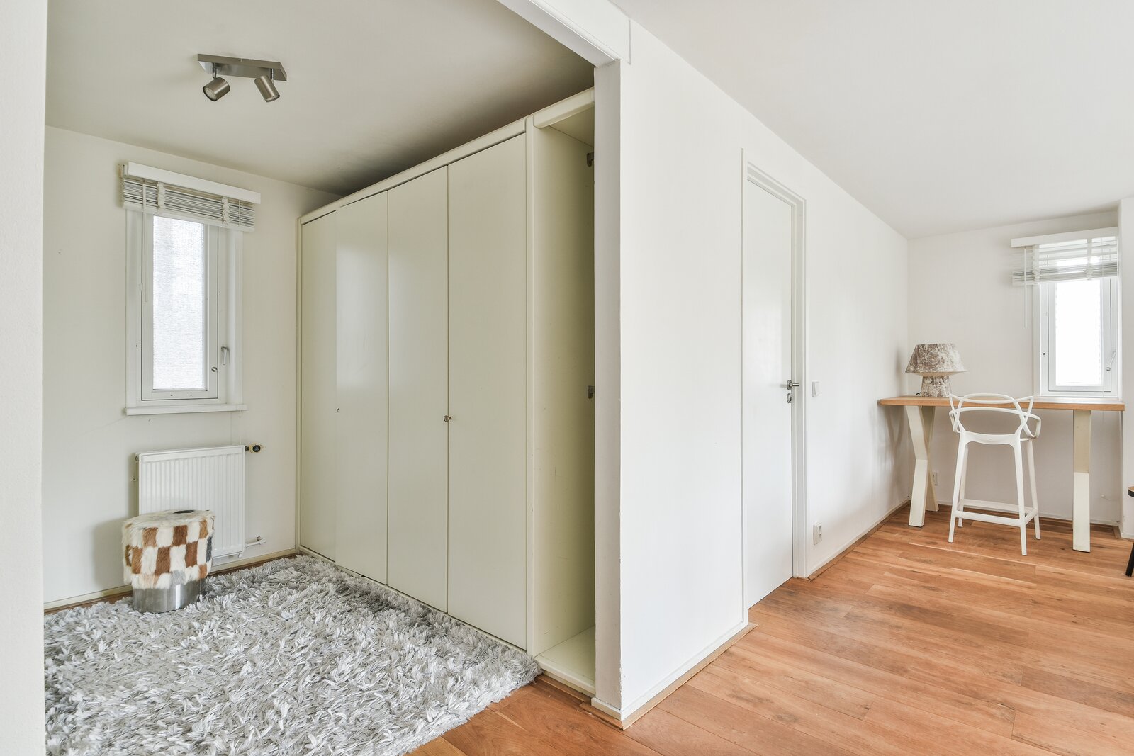 The entire floor is finished with wooden flooring, creating a warm atmosphere.