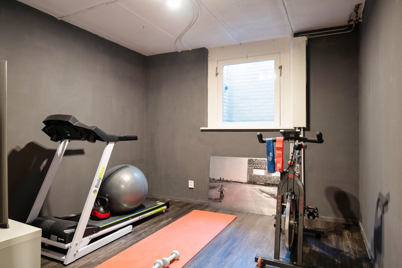 The stairs down in the hall lead to a surprisingly large basement with a fourth bedroom and a third bathroom (shower, toilet, and sink). With a separate entrance through the garage, the basement is ideal as a practice, office or living space for an au pair. The garage, with its electric garage door, offers space for one car.