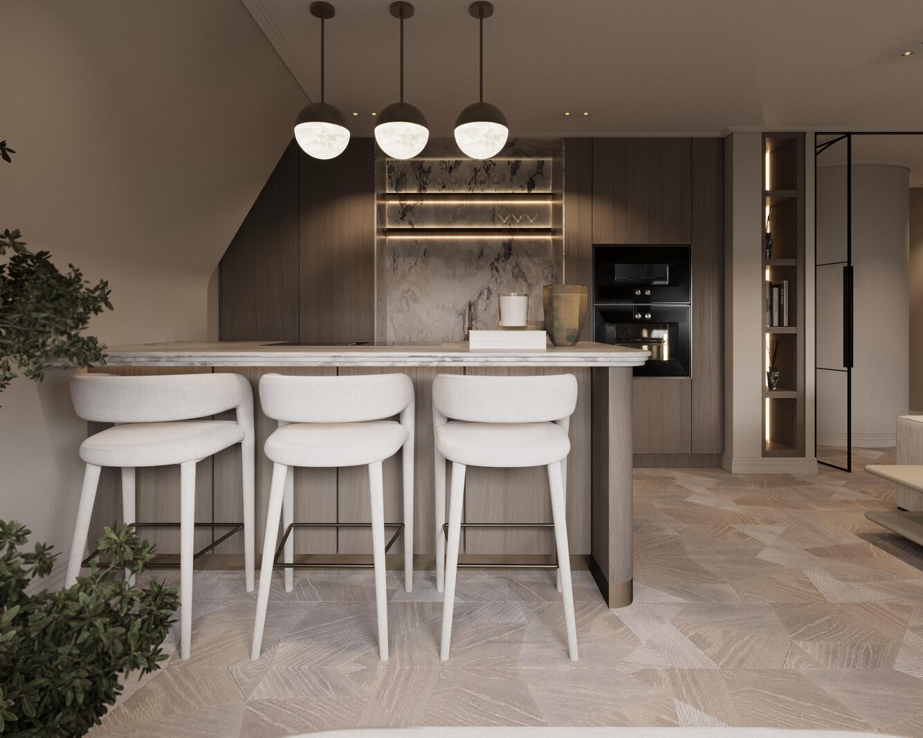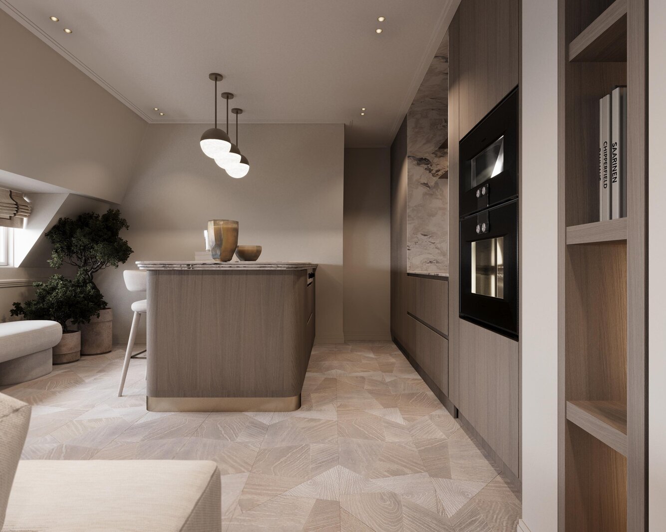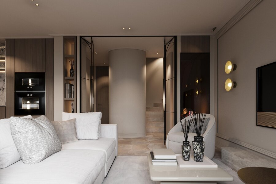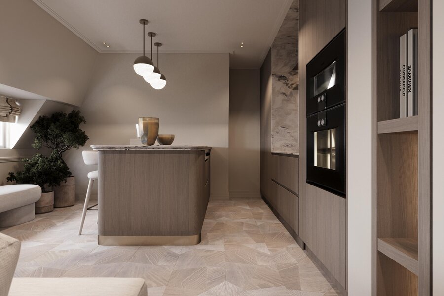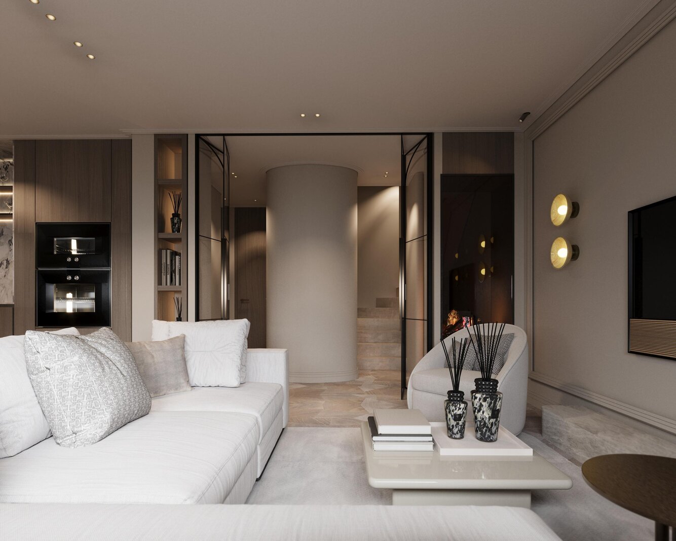The property is being completely renovated with great attention to detail, preserving its monumental character while introducing a refined, contemporary finish. The residences will be delivered turn-key and are defined by a carefully curated interior concept, featuring premium materials such as natural stone, bespoke woodwork, bronze accents, and sophisticated lighting.