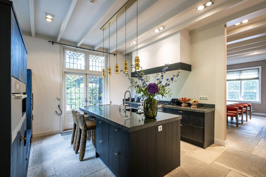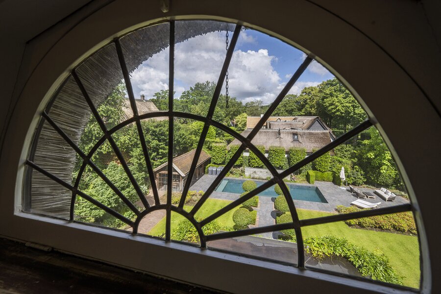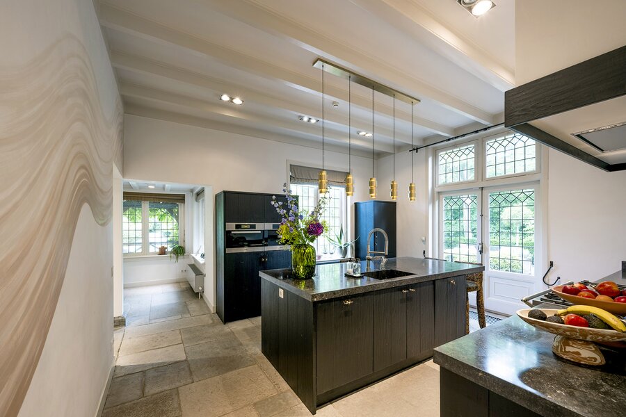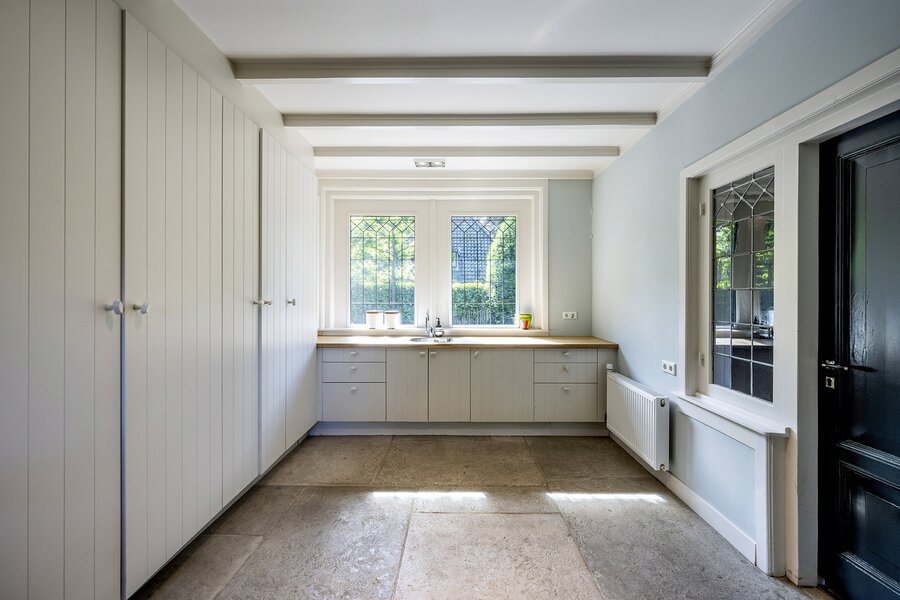 Entree, originele vestibule, royale hal (voorzien van Castle Stones) met bordestrap en de garderobe. Vervolgens komt u via de 'herenkamer' annex werkkamer met open haard in de woonkamer en de serre-kamer met prachtig zicht op de zonnige tuin, het zwembad en de terrassen. Aan de serre bevindt zich de sfeervolle aangebouwde veranda voorzien van verwarming. Onder de bordestrap zit nog een separaat toilet. De ruime en sfeervolle Tinello woonkeuken met hardstenen blad, spoeleiland en diverse inbouwapparatuur en een Lacanche fornuis met prachtig stucwerk op de wanden sluit aan op de eetkamer met open haard. Via de bijkeuken/wasruimte bereikt u de kelder en een zolderkamer (ofwel: een multifunctionele ruimte, te denken valt aan een ruimte voor een au pair bijvoorbeeld). In de wasruimte bevindt zich een tweede toilet. Een deel van de begane grond is voorzien van elektrische vloerverwarming.