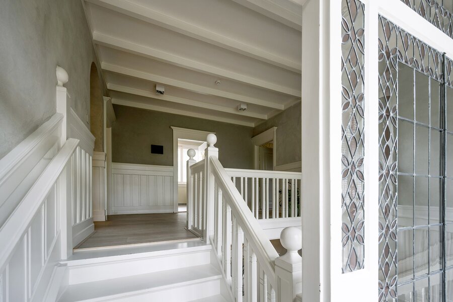 Middels het prachtig trappenhuis komt u via de bordestrap op de eerste verdieping. De overloop met toegang tot het bordes en balkon biedt uitzicht over de tuinen. Laat u verrassen door het ongelooflijke glas-in-lood in dit huis. Op deze verdieping bevinden zich drie royale slaapkamers, waarvan de masterbedroom uiteraard ook een eigen kleedkamer heeft en een moderne badkamer, voorzien van ligbad, douche, dubbele wastafel en toilet. De tweede badkamer is voorzien van douche, dubbele wastafel en een ligbad. Er is naast deze badkamer een separaat toilet aanwezig. De gehele verdieping is voorzien van houten vloeren en shutters voor de ramen.