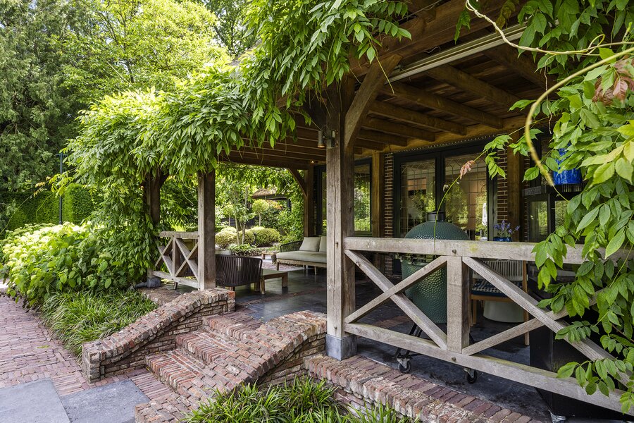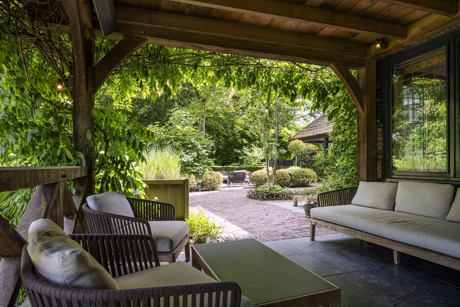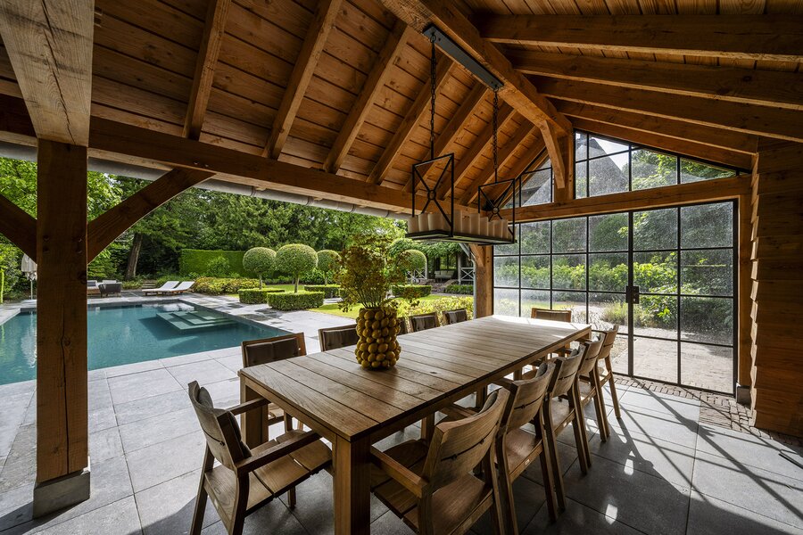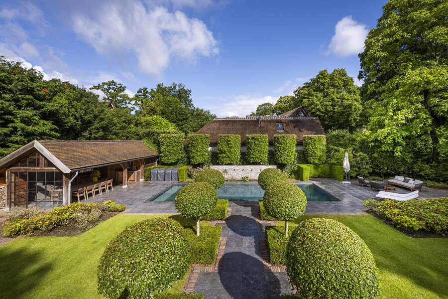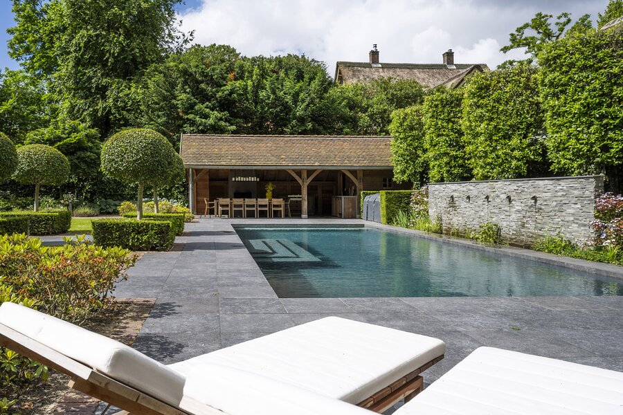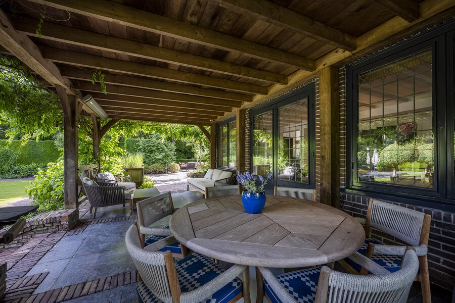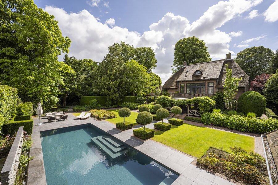 Het geheel met voormalige garage (thans een heerlijke grote bijkeuken/waskamer), berging en carport is omzoomd door de zeer fraai aangelegde tuin met verschillende terrassen, verwarmd zwembad met waterval, een buitenkeuken en sauna met een totale oppervlakte van 2.210 m².