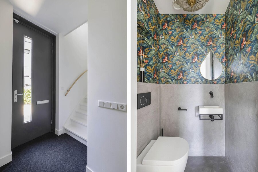 Entree, trapopgang en modern toilet met fontein. Via de deur bereik je de uitgebouwde woonkamer en eetkeuken. De prachtige en moderne keuken bevat een kook- en spoeleiland met keramisch blad, wijnklimaatkast en barfunctie.