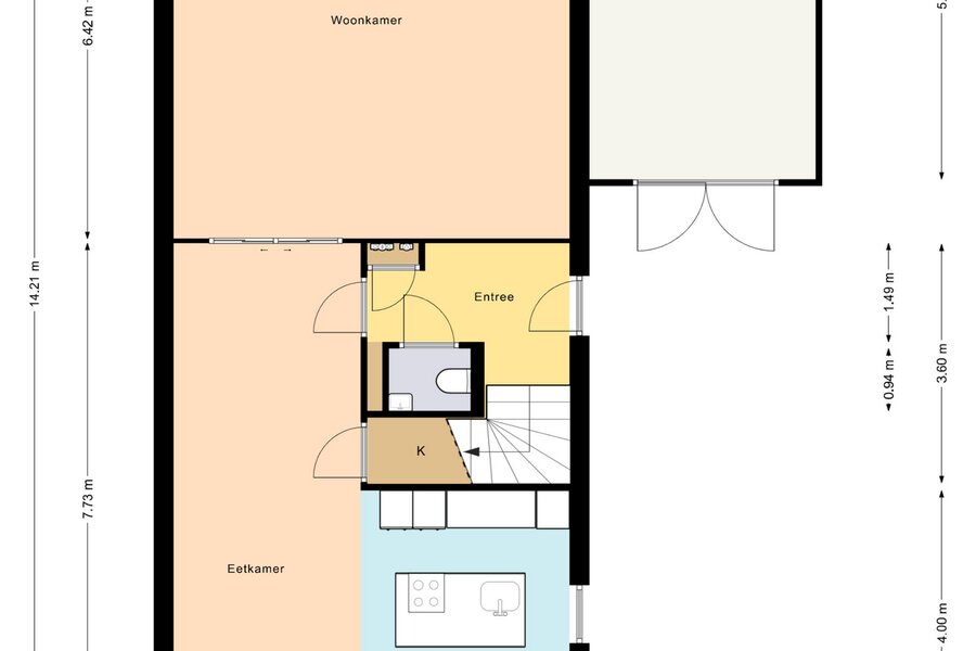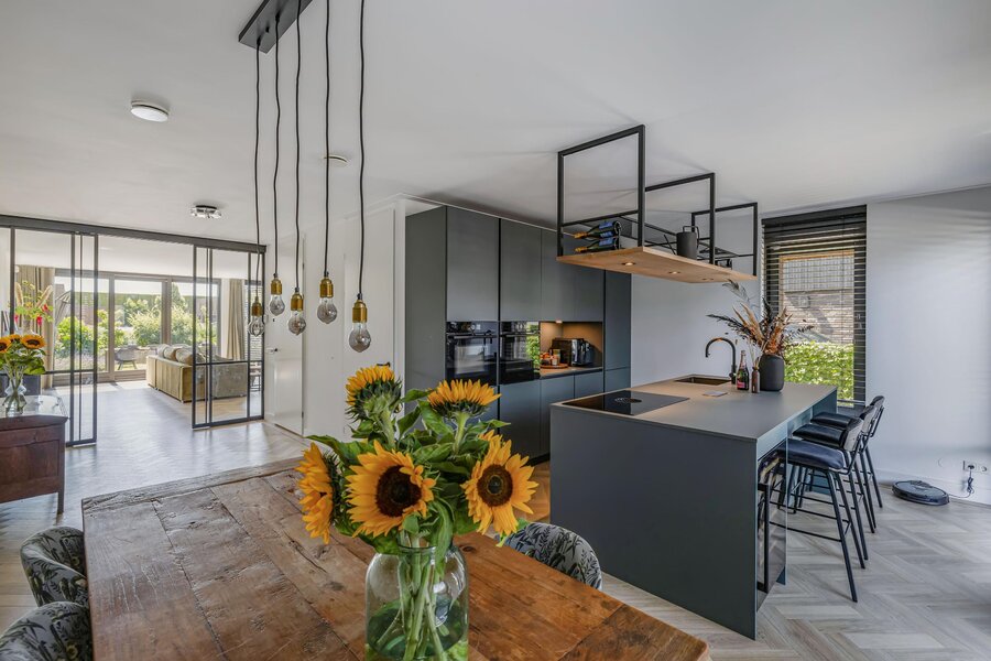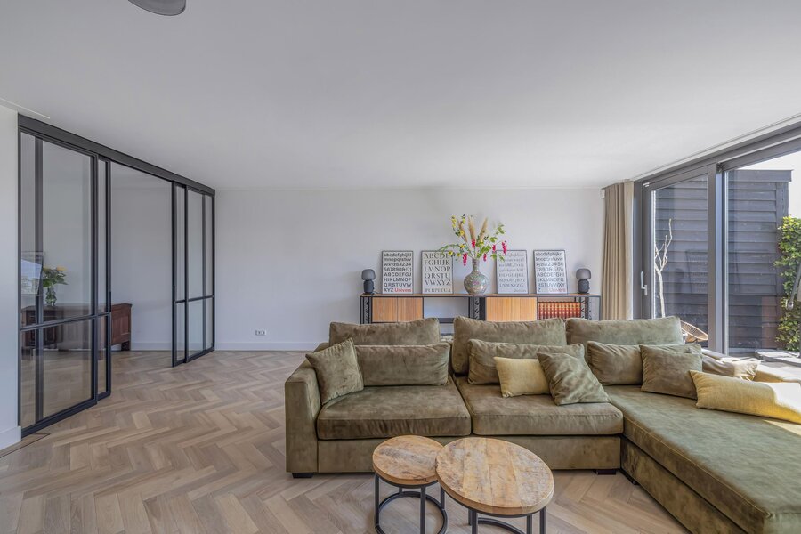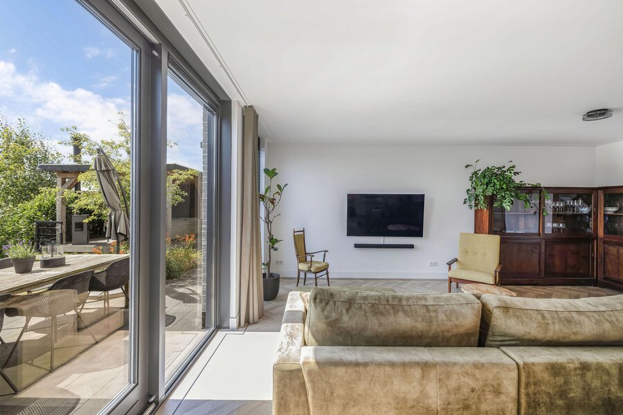 Via de mooie stalen ensuite deuren komt u in de heerlijk lichte uitgebouwde woonkamer. De schuifpui geeft toegang tot de achtertuin.