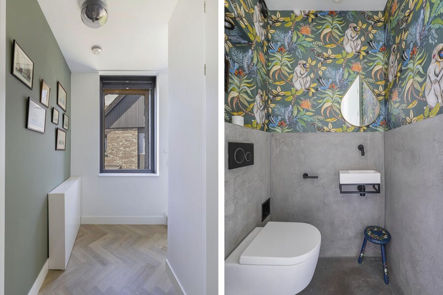Verder is er een separaat toilet met fontein. (Toiletten op begane grond en 1ste verdieping zijn identiek qua materiaalafwerking). De vloer is hier ook afgewerkt met een visgraat gelegde pvc vloer.
