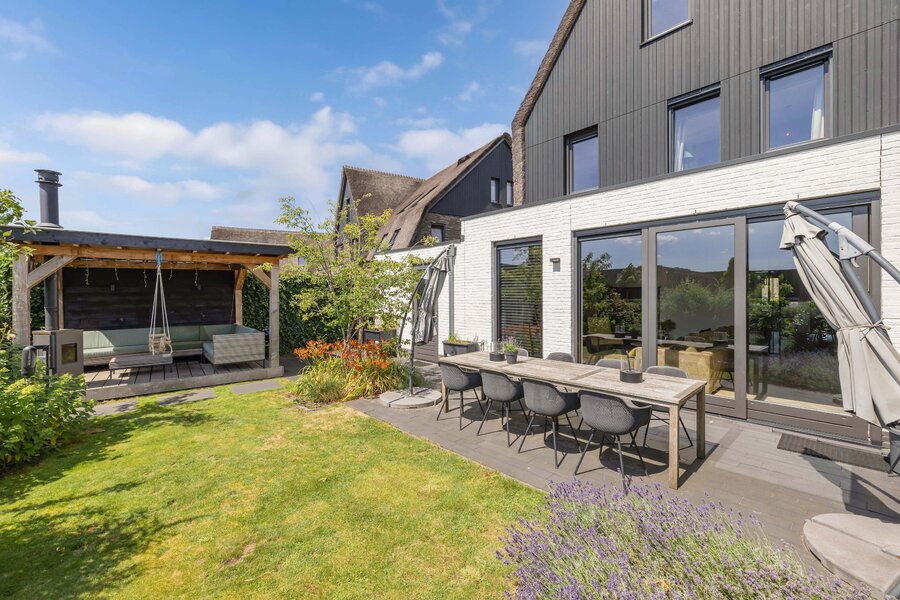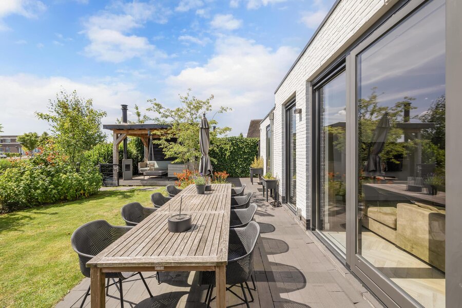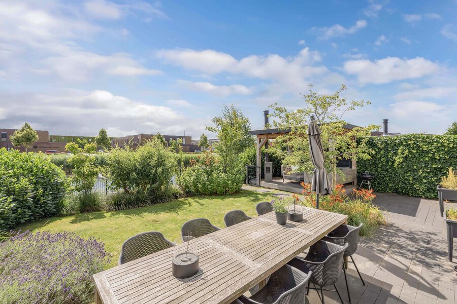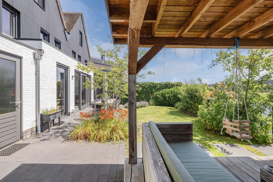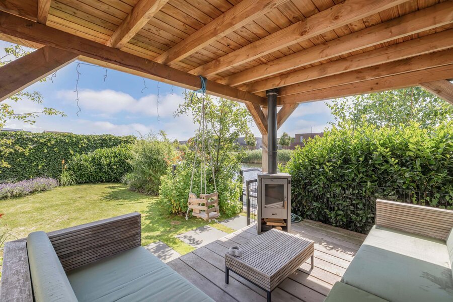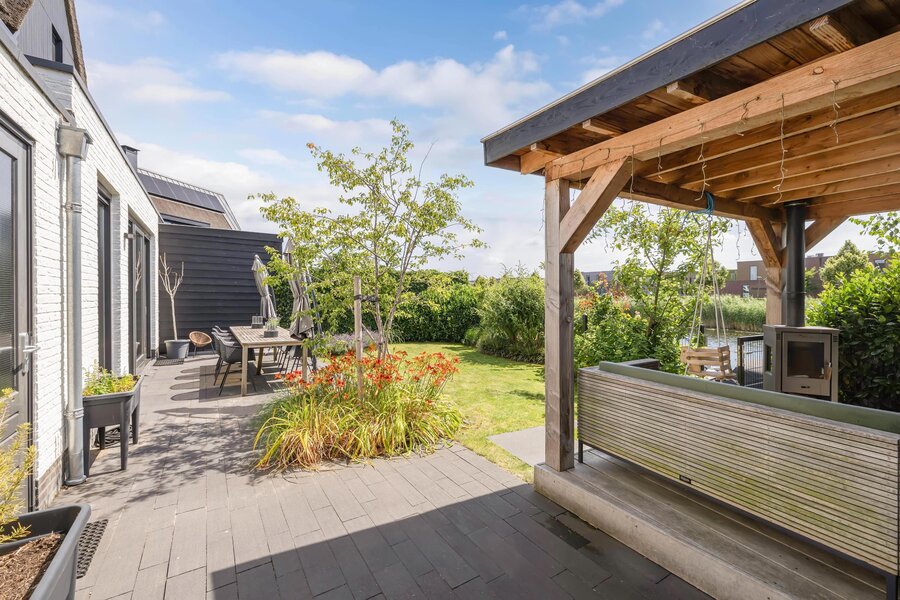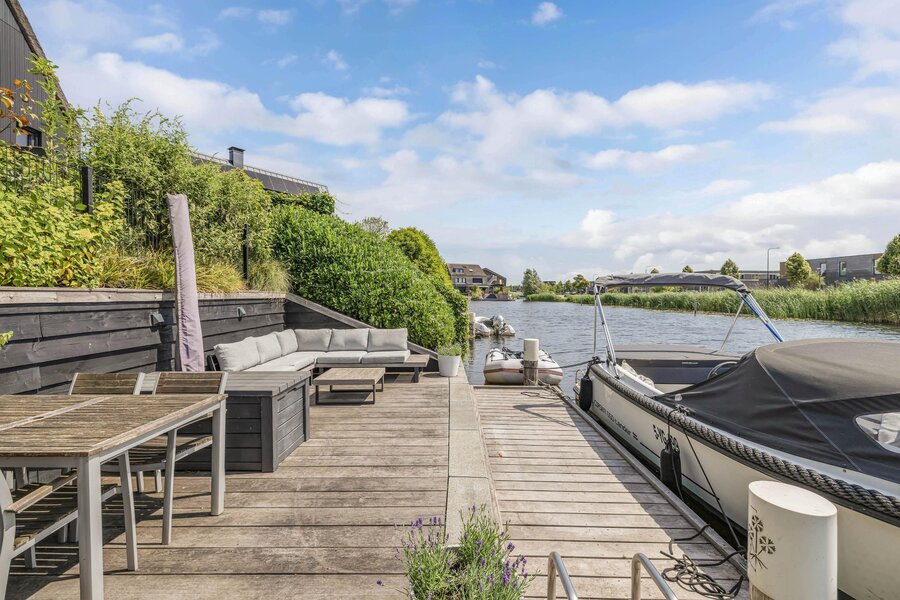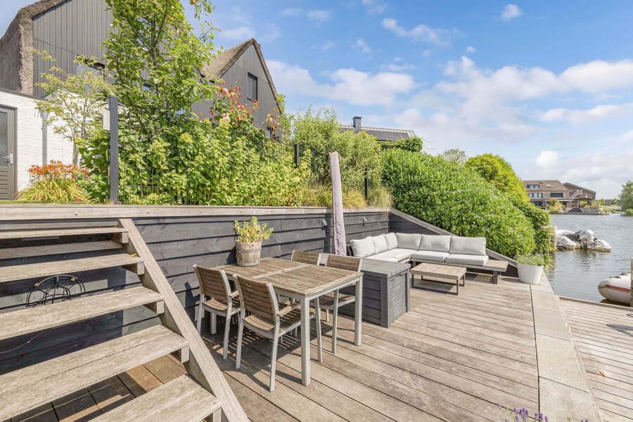 De fraai aangelegde achtertuin is een waar paradijs; niet alleen met een groot zonnig terras, maar ook met een charmant vlonderterras aan het water.