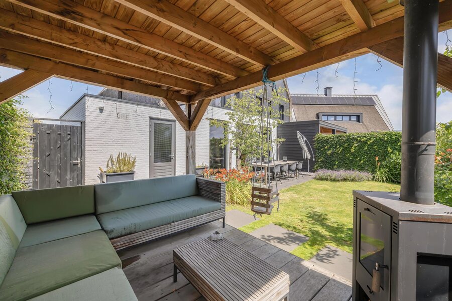 Aan de zijkant van de tuin is een mooie houten overkapping geplaatst met een houtkachel voor de koudere dagen.