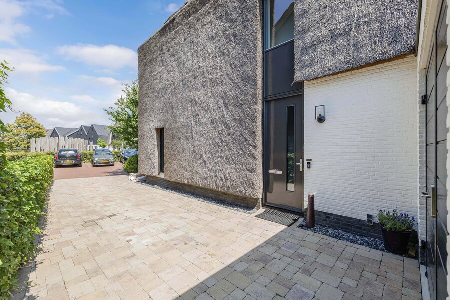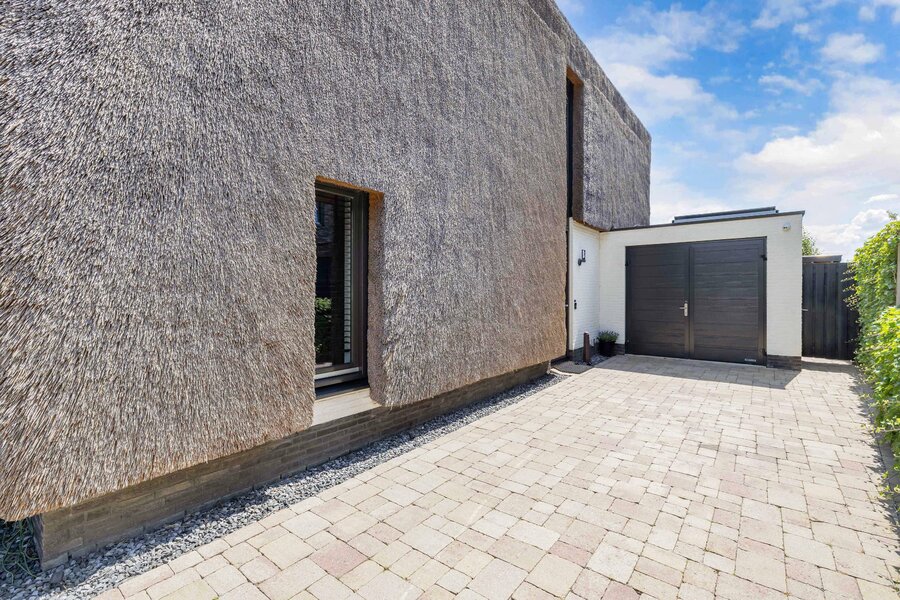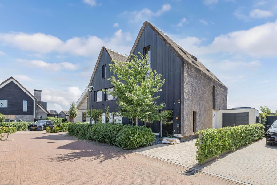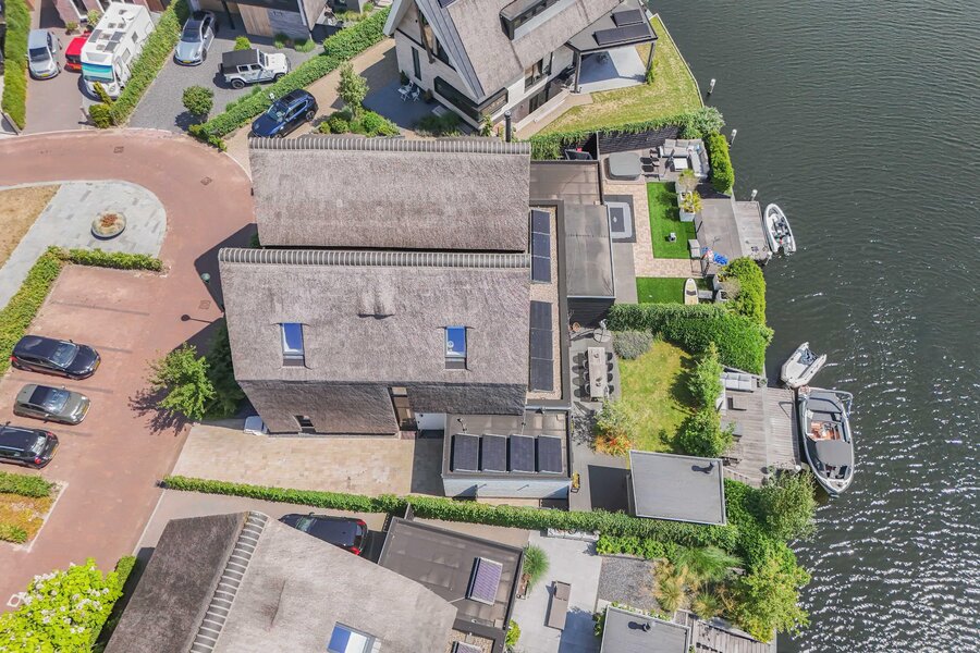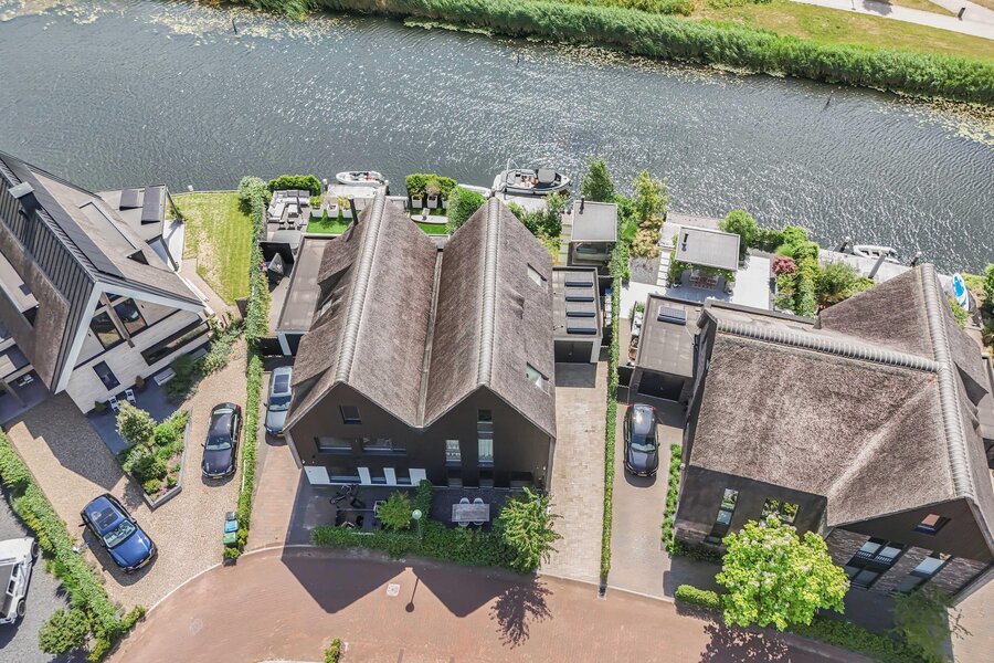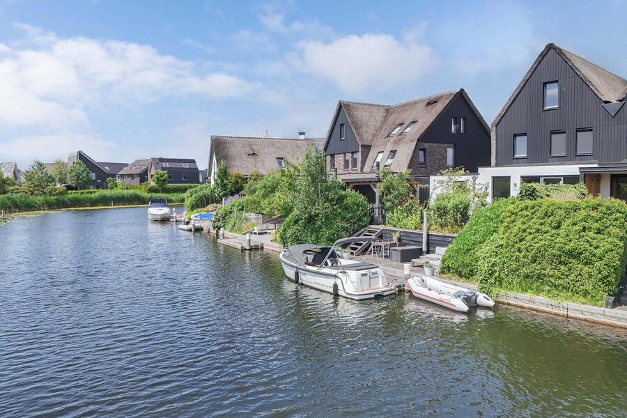 Zeer luxueuze uitgebouwde helft van dubbele villa met rieten kap aan het vaarwater gelegen met aangebouwde garage en tuin.