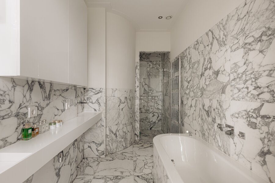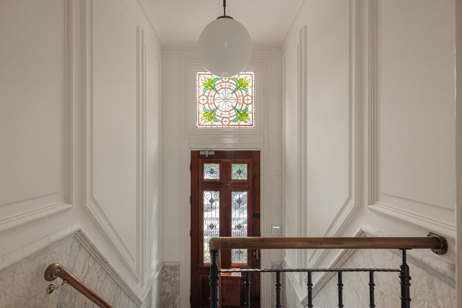 You enter this distinguished residence through an impressive entrance hall with high ceilings, marble accents, and classical ornamentation. From the hallway, you can access both the bel-etage and the lower ground floor.